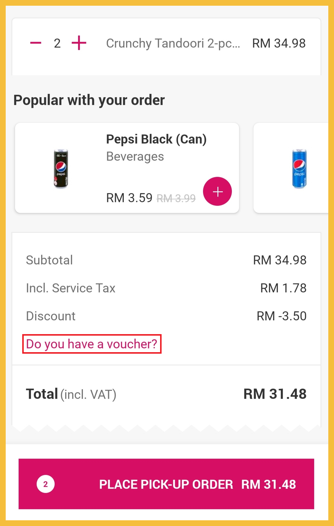 ※ 2份2块炸鸡Crunchy Tandoori 套餐 原价RM34.98,折扣10%【Pick-UP】+折扣RM7【JOY】,后只需RM24.48!相等于一份套餐只需RM12.24!