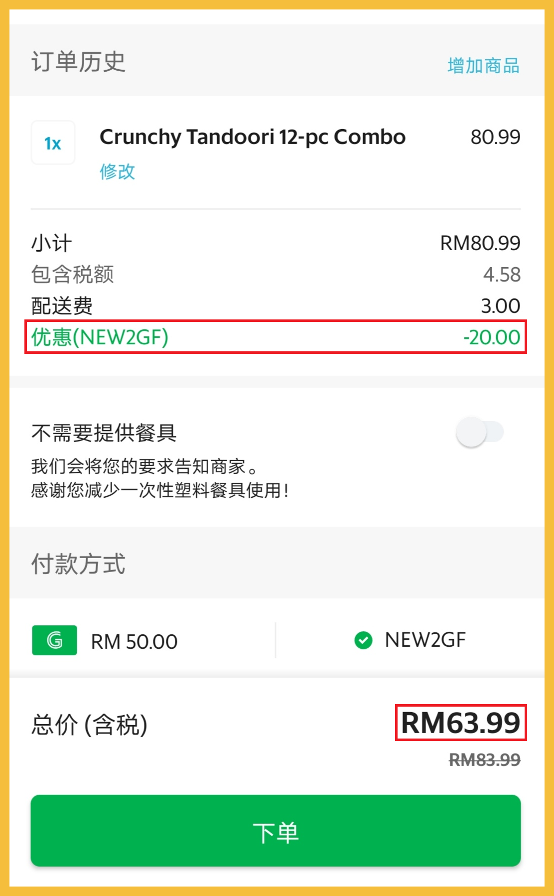 ▼ 一份原价RM80.99 的12块Crunchy Tandoori 炸鸡,折扣RM20后只需RM63.99(价钱包含RM3外送费用)!平均一块炸鸡只需RM5.33!