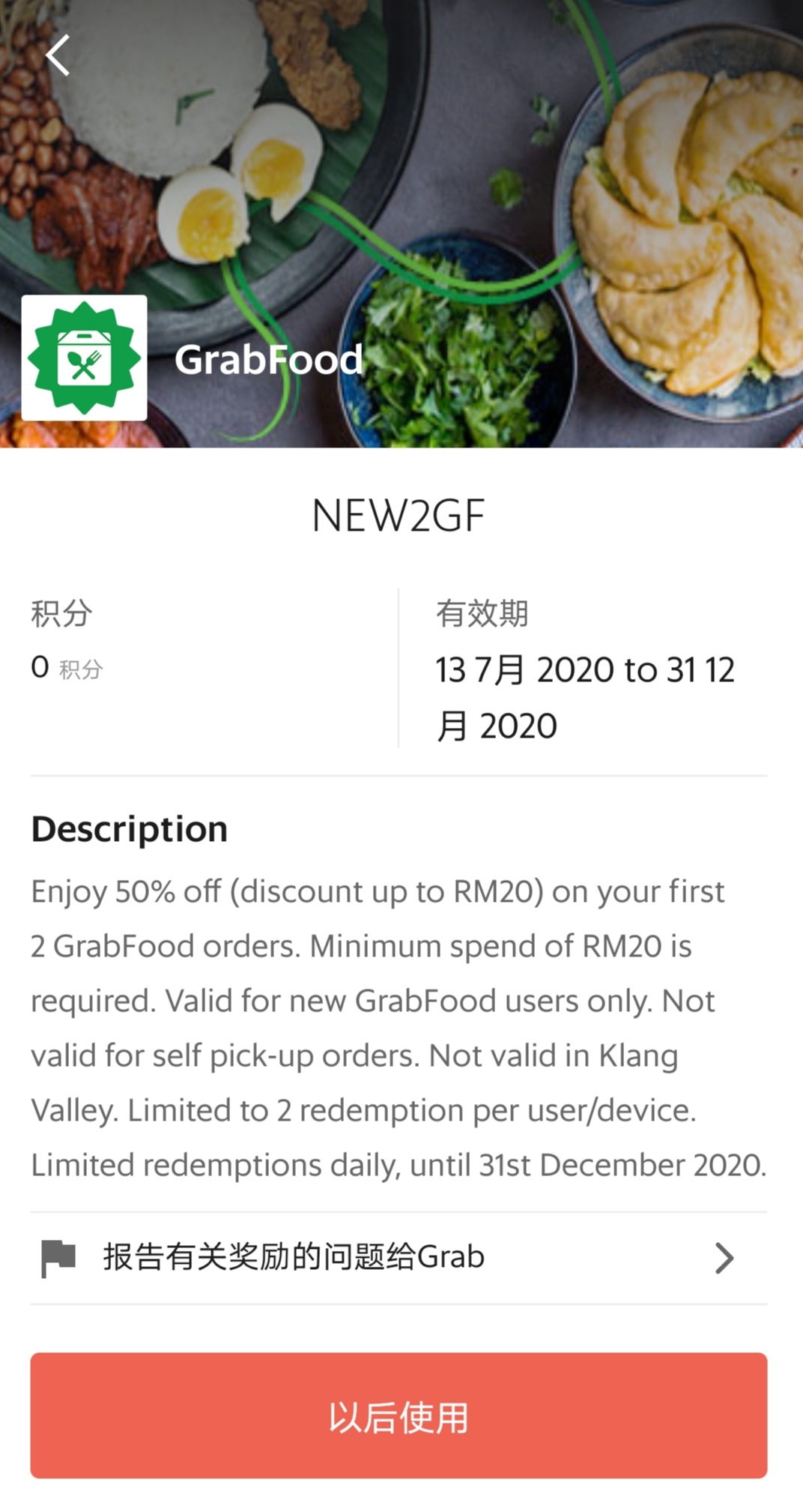 - 必须消费满RM20,可获得高达RM20折扣