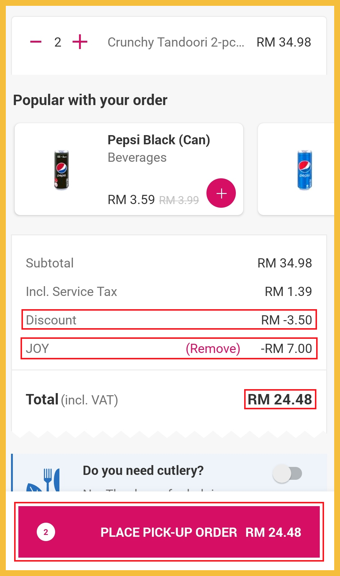 ※ 2份2块炸鸡Crunchy Tandoori 套餐 原价RM34.98,折扣10%【Pick-UP】+折扣RM7【JOY】,后只需RM24.48!相等于一份套餐只需RM12.24!
