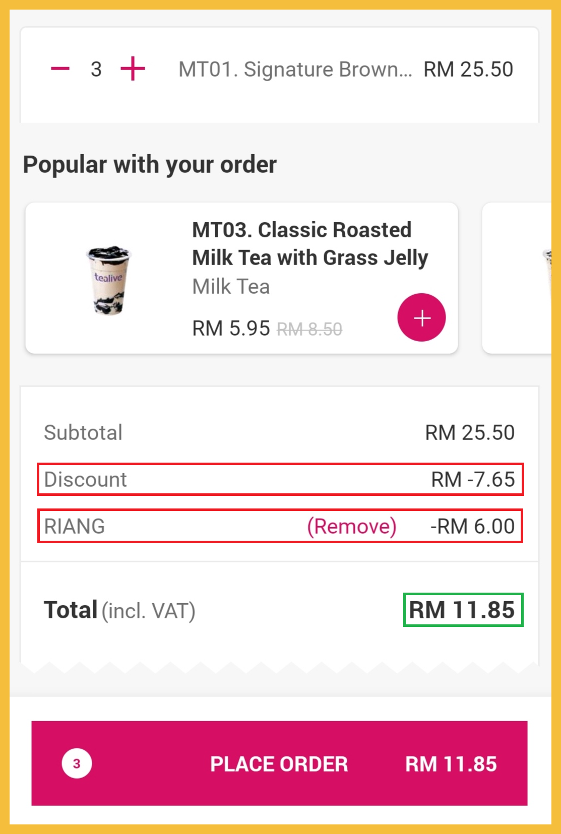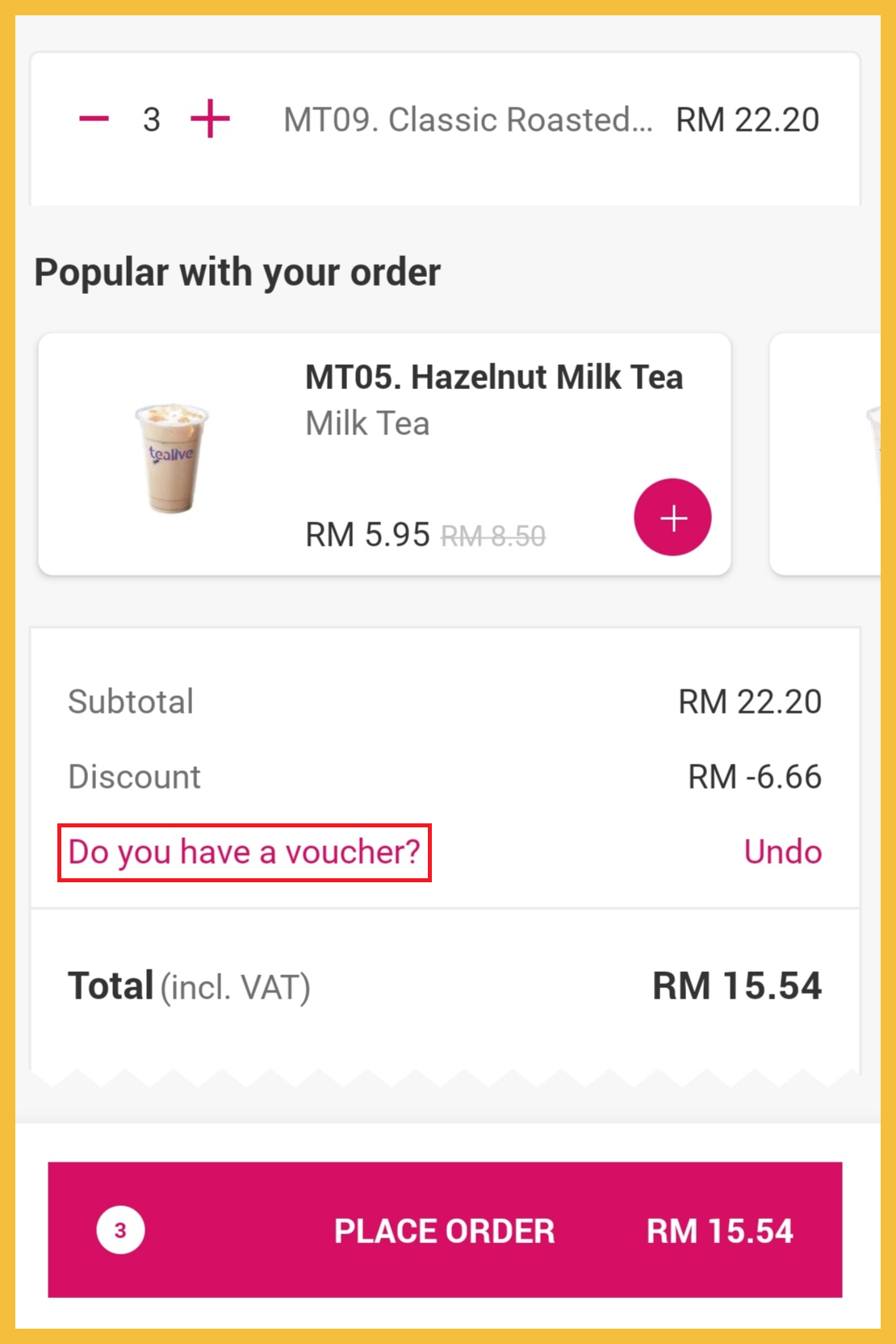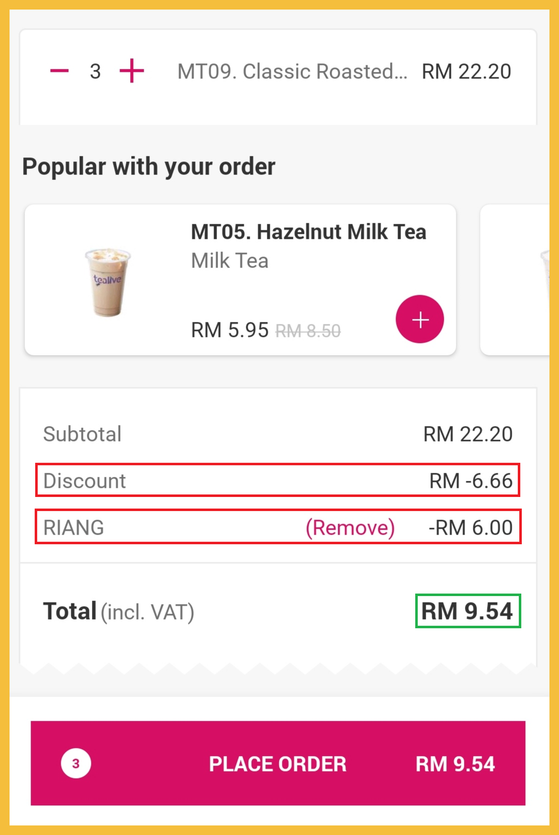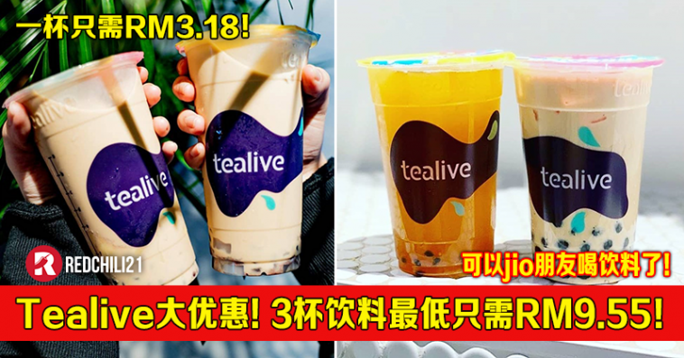 ※ 3杯Tealive 饮料原价RM22.20,折扣30%+RM6折扣后只需RM9.54!(平均一杯只需RM3.18)