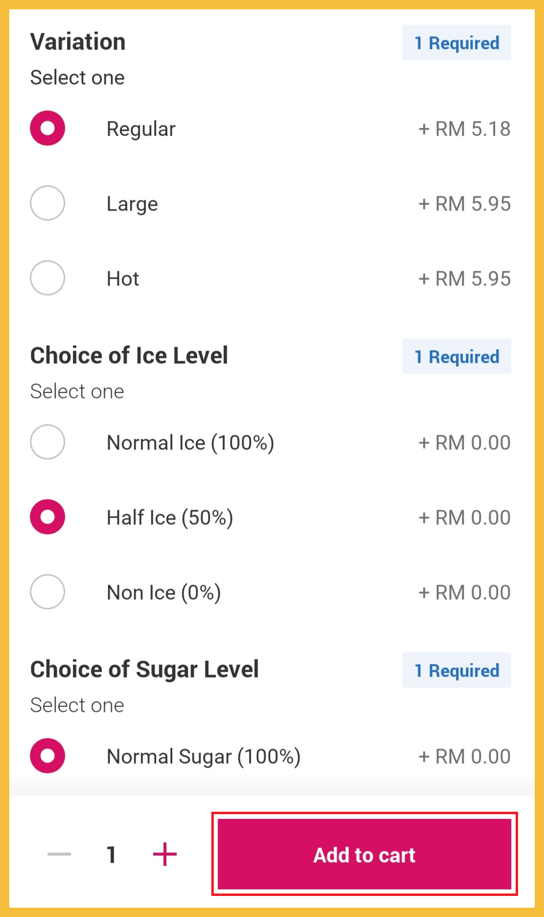 步骤 3:选择你想小/大杯装的饮料及添加任何配料 !