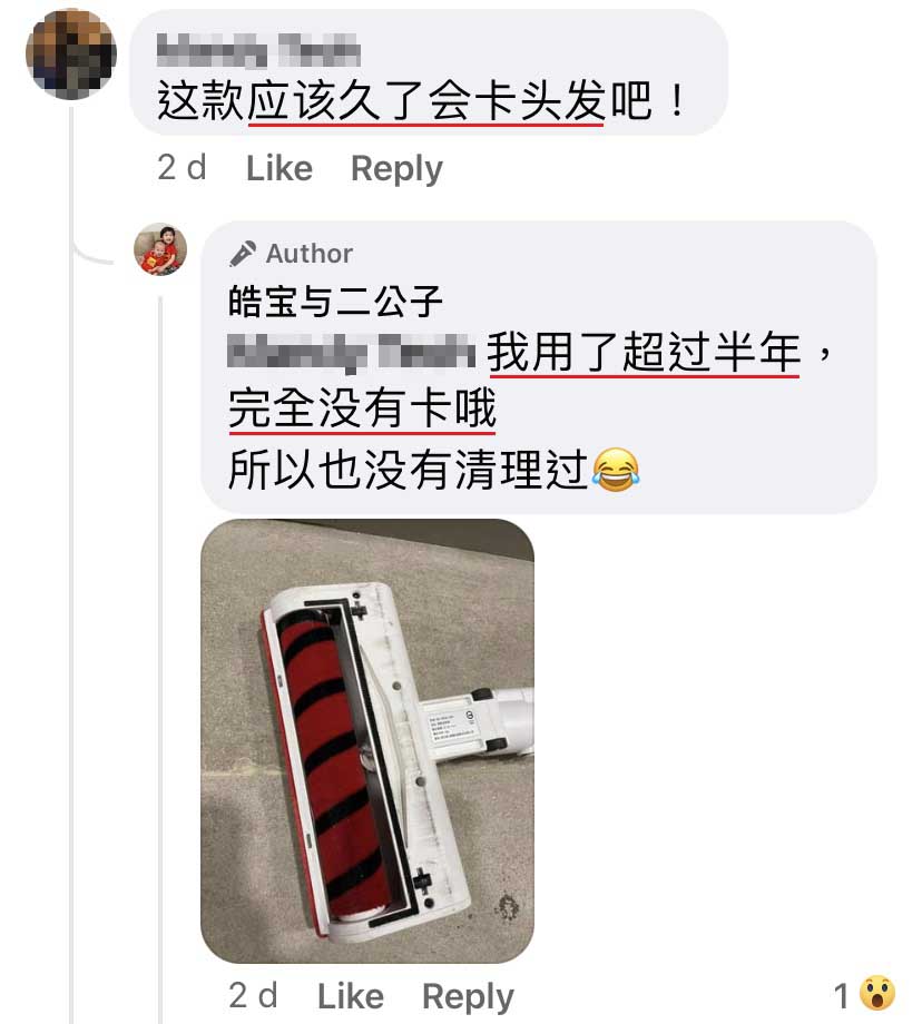 还有一个我很满意的是,它不缠毛发!因为我最近脱发严重,每次梳完头后一定会满地头发。之前的吸尘机吸头,我每次都拔那些缠在吸头的头发,拔到我半条命,又脏!