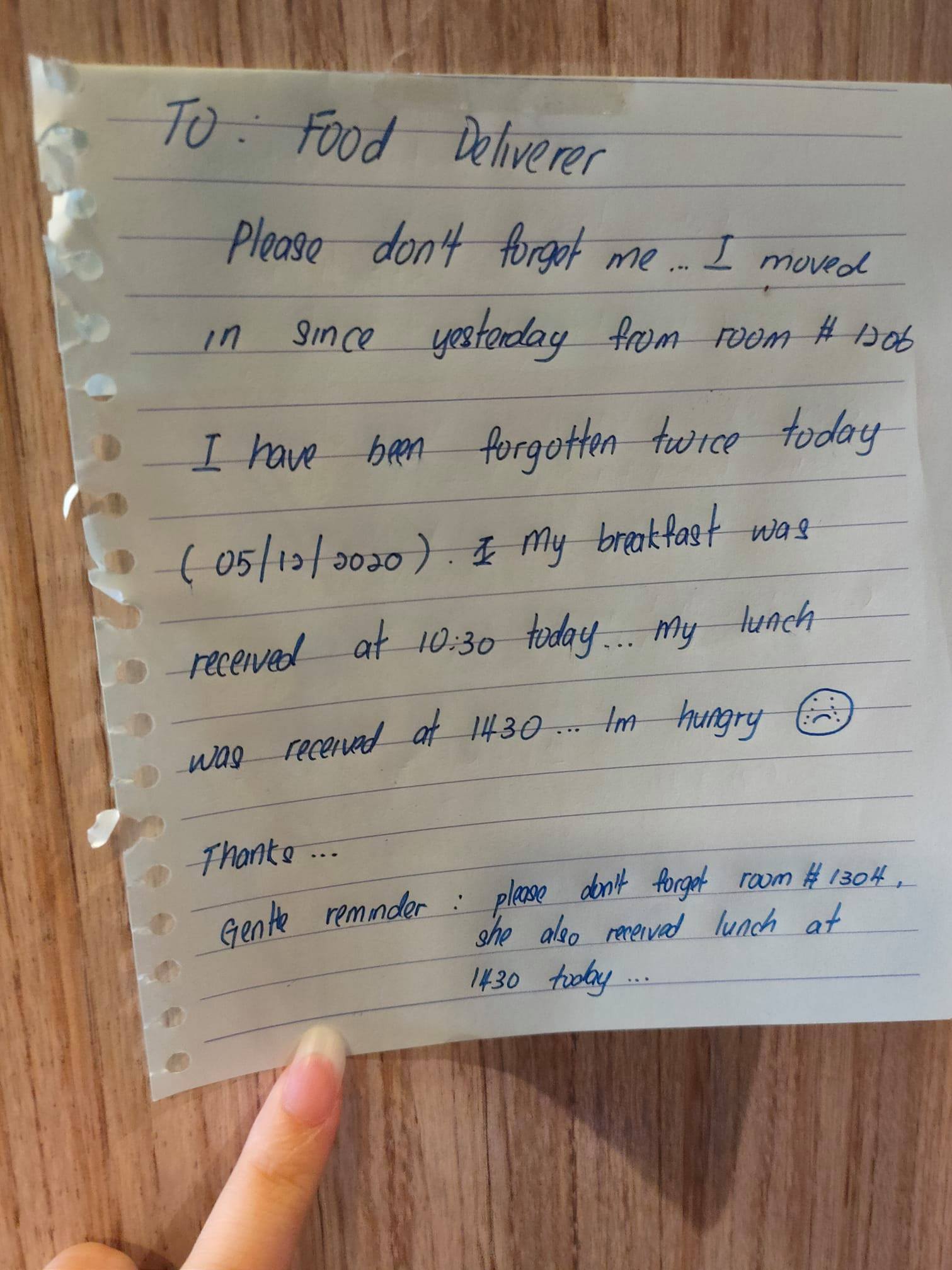 ▼「致送餐员。我今天已经被遗忘了两次,我的早餐是今天10:30am才收到,午餐是2:30pm才收到的,我肚子饿。」