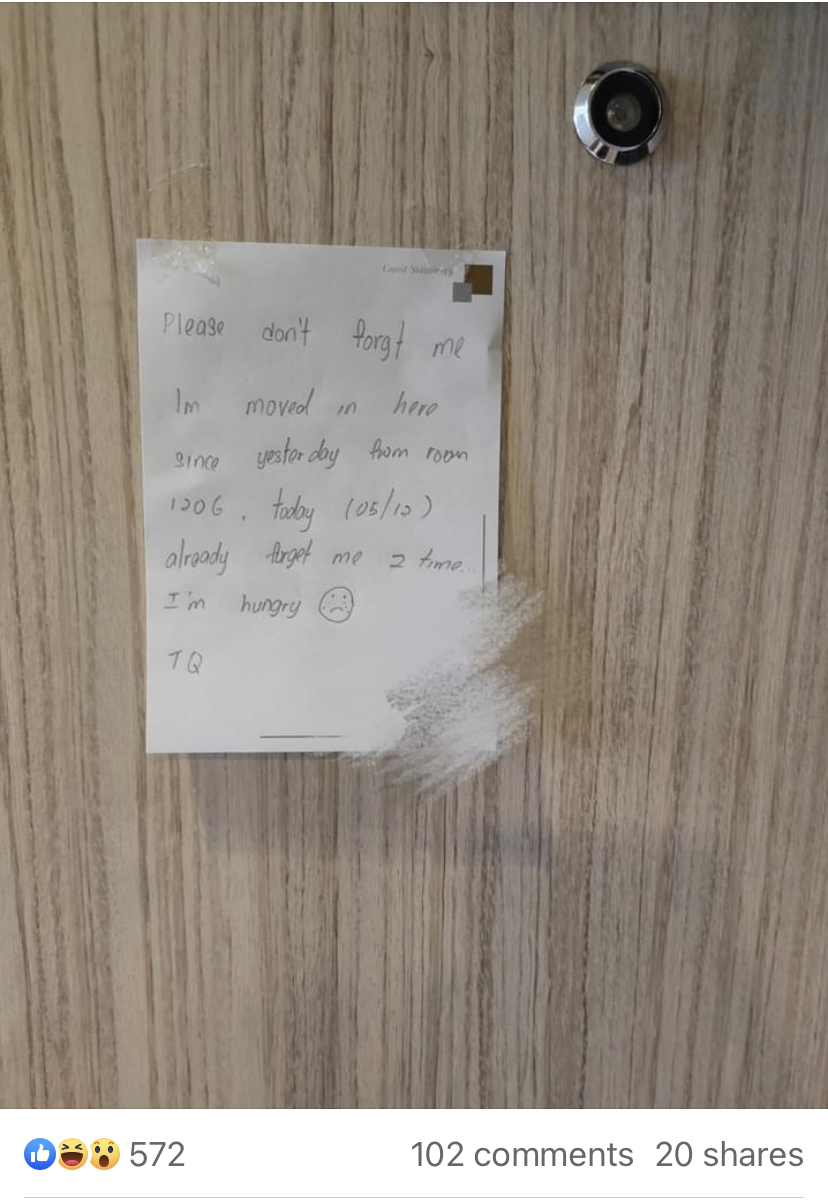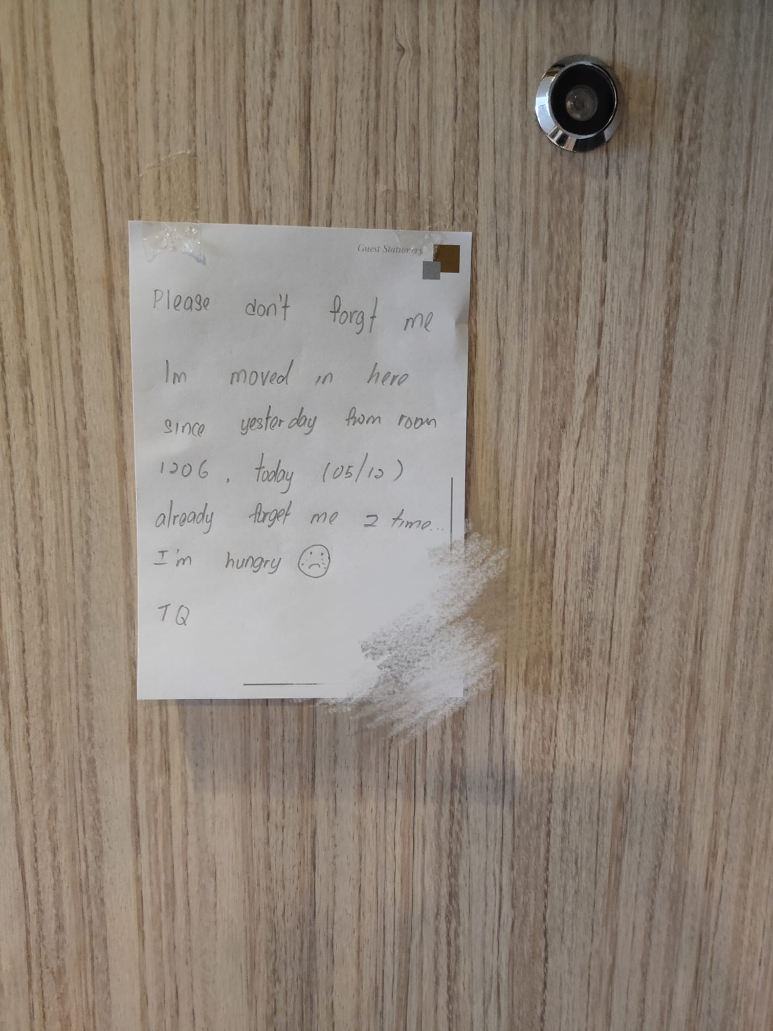 ▼ 她在她的酒店房门贴上一张小纸条,纸条上写着:「请不要再忘记我!我是昨天入住的1206号房客,今天(05/12)已经忘记我两次了。我肚子饿了,谢谢!」