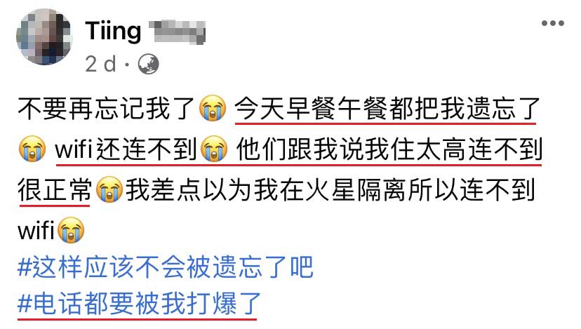 女网友在帖文里写道:「不要再忘记我了!今天早餐、午餐都把我遗忘了,wifi还连不到!他们跟我说:我住太高,连不到很正常!我差点以为我在火星隔离,所以连不到wifi!这样应该不会被遗忘了吧?电话都要被我打爆了。」