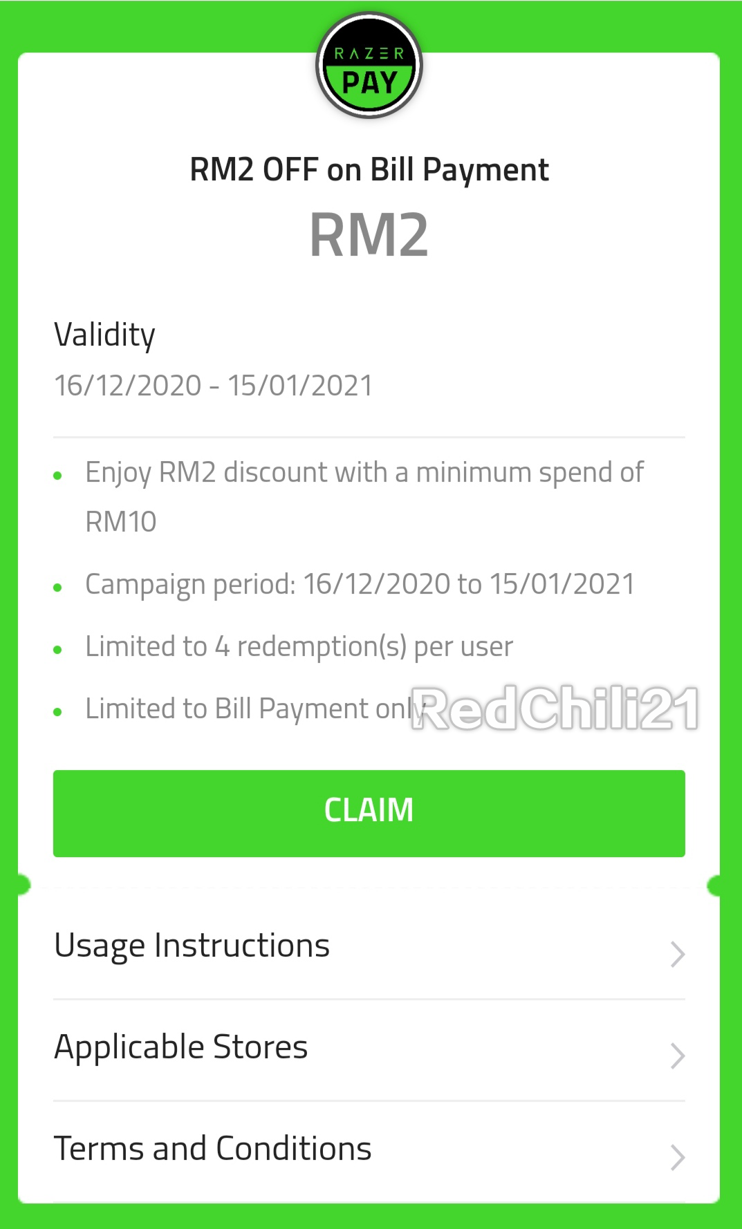 促销活动:Razer Pay 缴付账单优惠券,可获得RM2 折扣