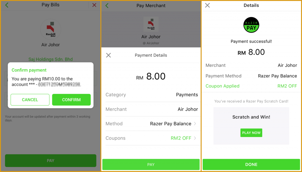 3)使用Razer Pay 来缴付水电杂费可获高达RM158 的现金回扣!