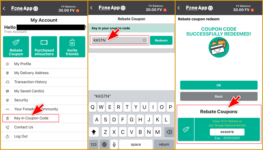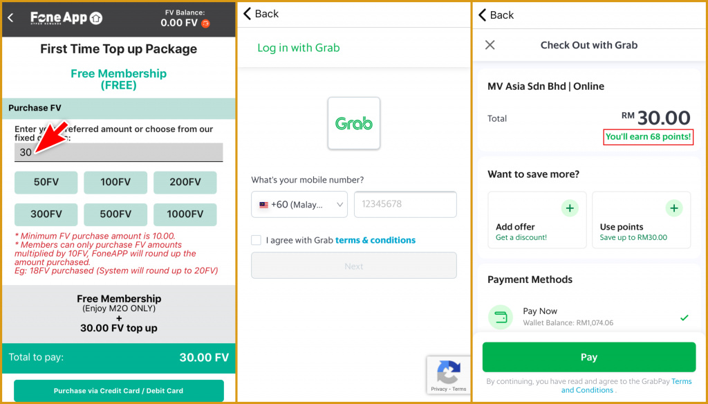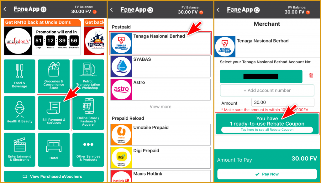 先充值你的Fone App 户口 (为了获得TNB 的RM10折扣,你必须充值至少RM30)