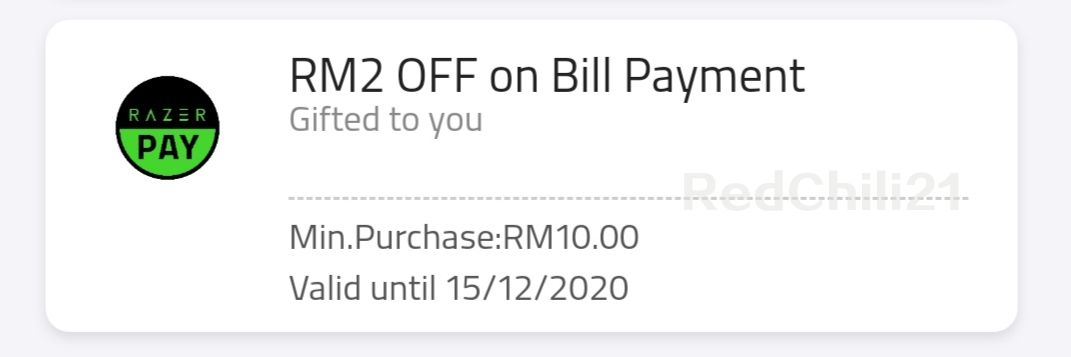 促销活动:Razer Pay 缴付账单优惠券,可获得RM2 折扣