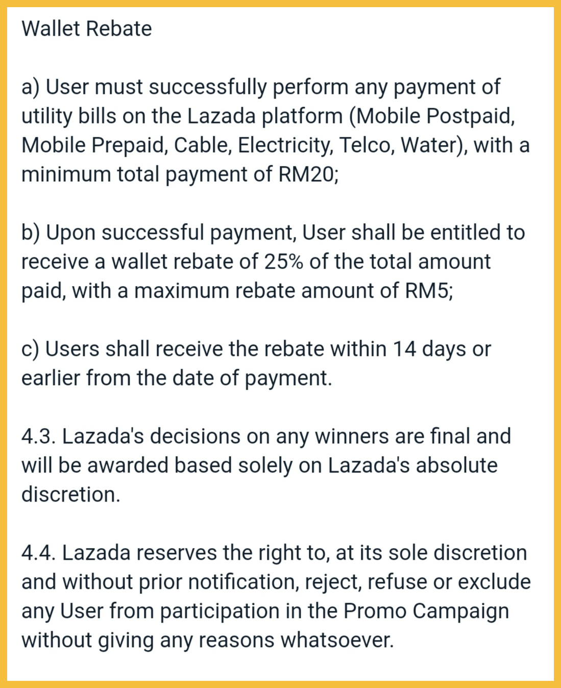 - 必须消费至少RM20 ,才能获得25%现金回扣(最多可获得RM5现金回扣)