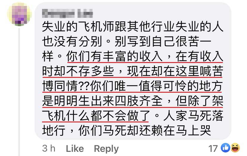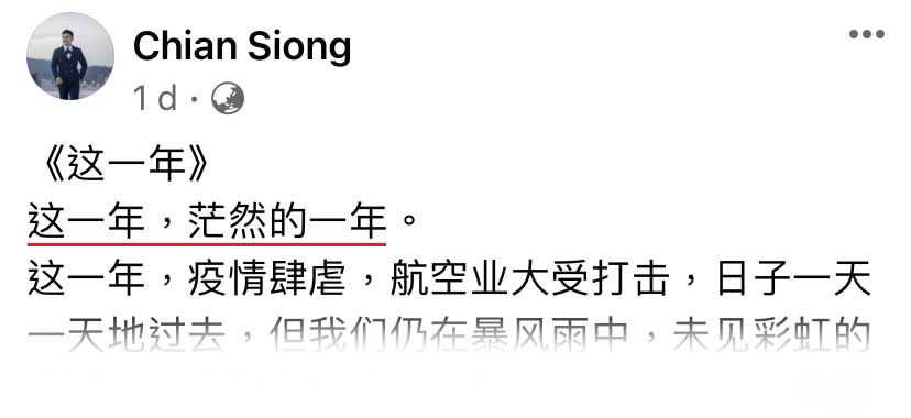 大马一名飞机师近日在面子书发长文引起许多共鸣,他感慨地分享道在过去的这一年,他因为疫情而面对的迷茫和打击,并希望通过这样的帖子与网友们共勉之!