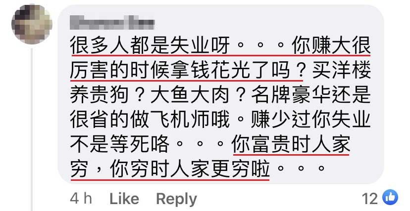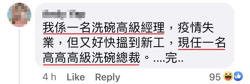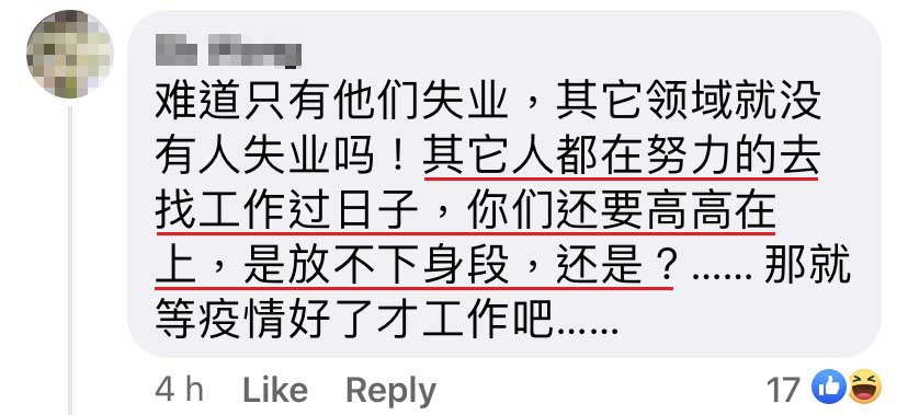 在做送餐员的、洗车员的、卖食物的、制作蛋糕甜点的、网卖的,还有我货仓管理员彼此撑着吧,相信会熬过的一天。那些落井下石的,看不起我们的… 放心,我们会回来的。
