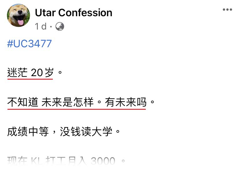 近日一名大马网友在“Utar Confession”投稿发文,因为家里经济困难导致他无法读大学。年仅20岁的他置身于工作薪资的局限,因而感到很迷茫!