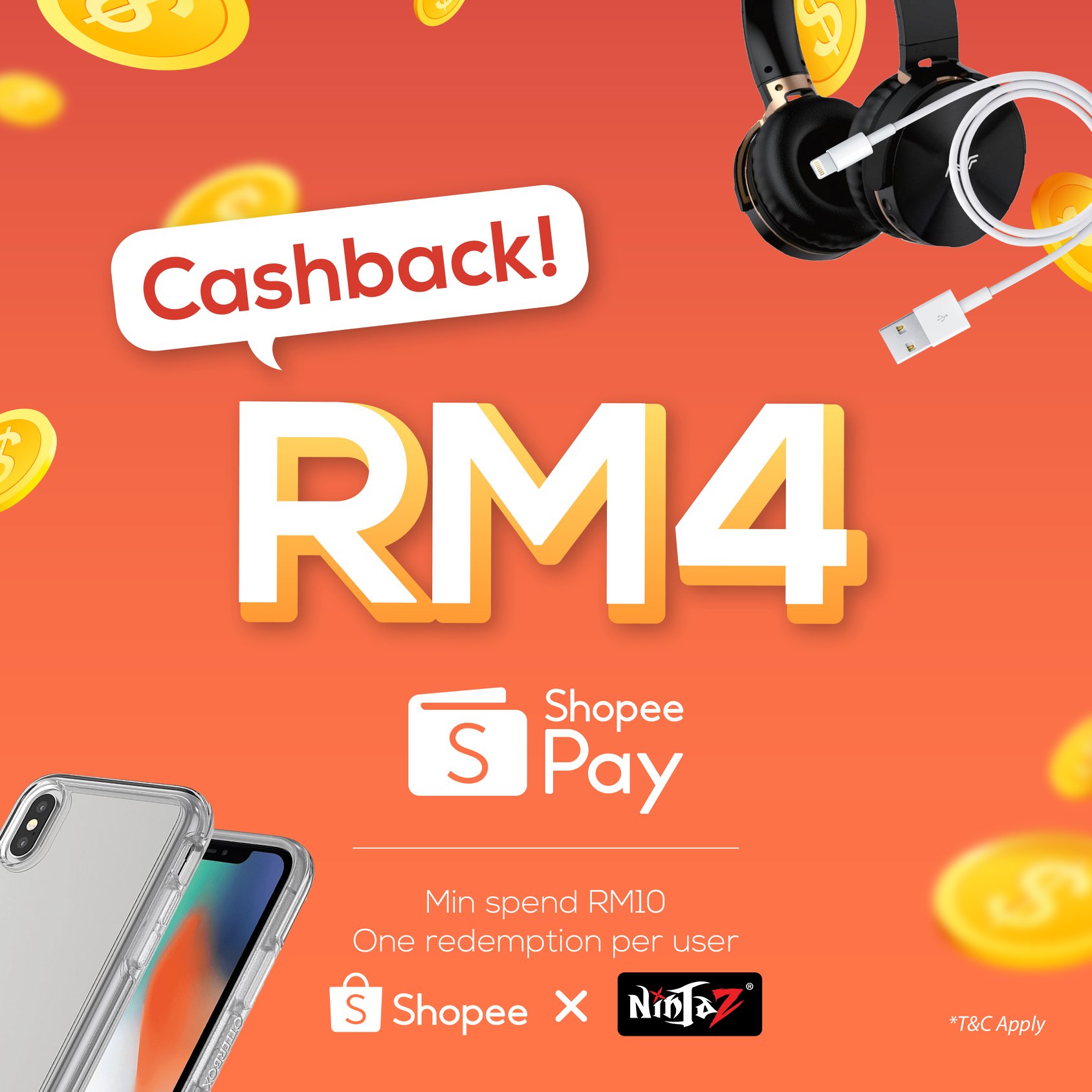 促销活动: 使用Shopee Pay 付款并消费RM10,可获得RM4现金回扣