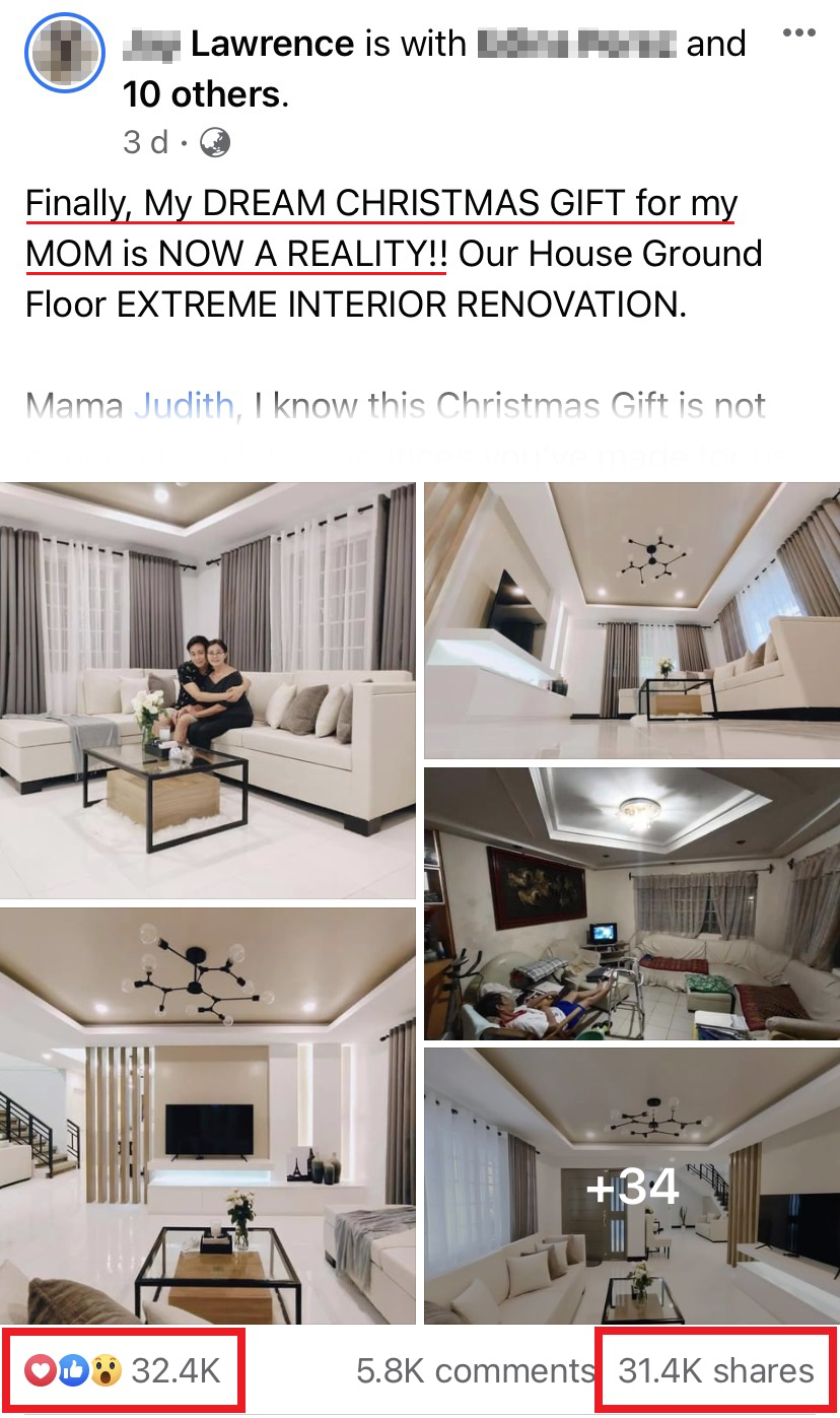 一则帖子近日在面子书疯传,菲律宾一名男网友将父母居住的老家重新装修,当作圣诞节礼物送给母亲!翻新后的屋子超漂亮,但更美的是他那颗孝敬父母的心!