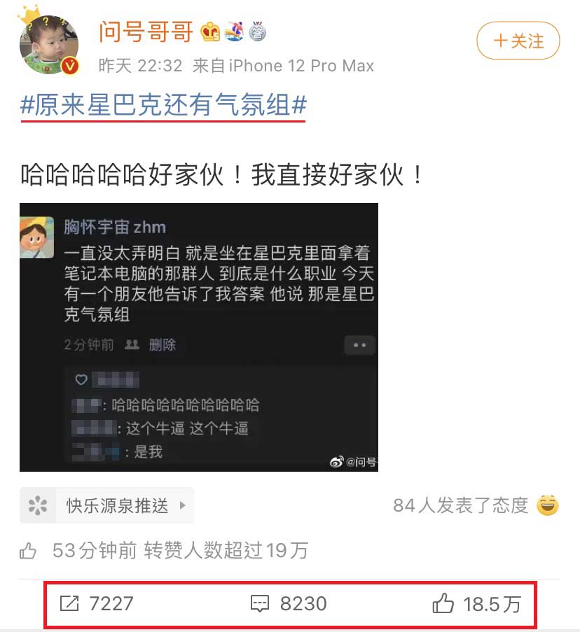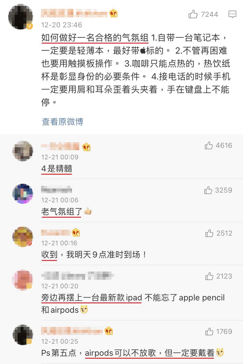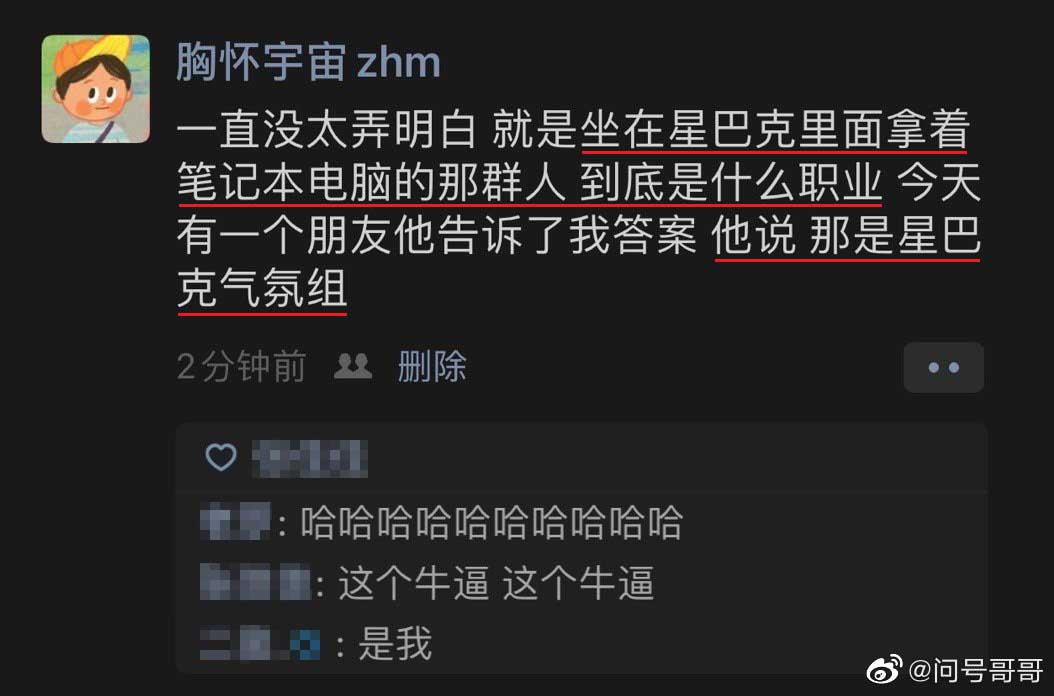 中国一名网友在微信朋友圈发了一条信息,写着:「一直没太明白,就是坐在星巴克里面拿着笔记本电脑的那群人,到底是什么职业?今天有一个朋友他告诉了我答案,他说:那是星巴克气氛组。」