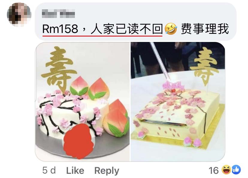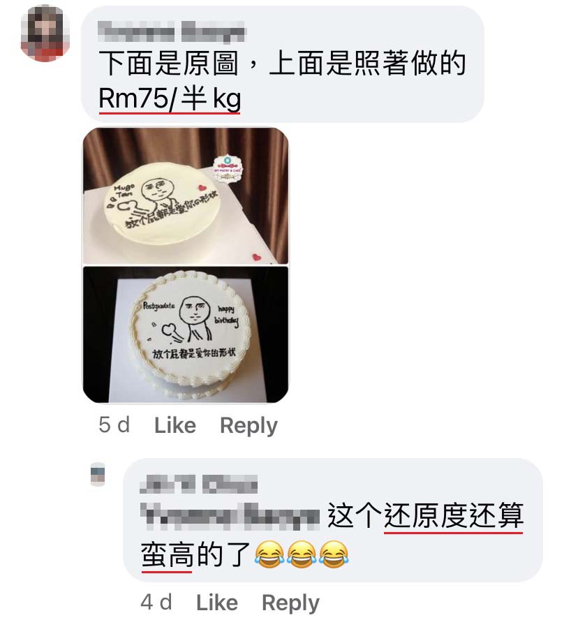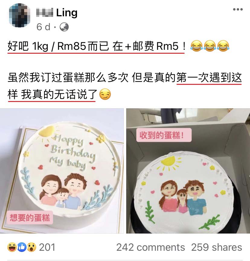 女事主在面子书发文表示,自己在网上订购了生日蛋糕。1公斤的蛋糕加邮费仅需 RM85,卖家也答应做出她想要的模样,因此她就下单了。结果当天收到蛋糕的时候,她无言了。