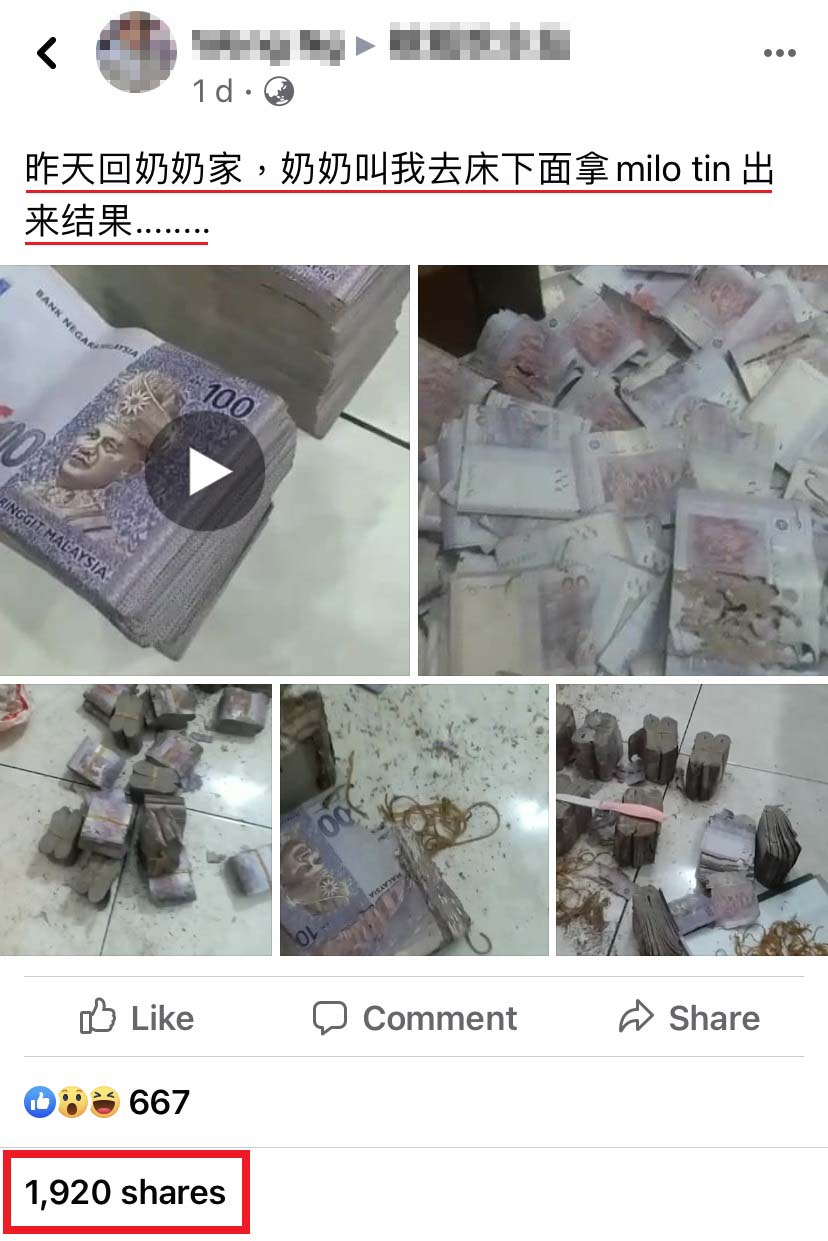 日前一名大马网友在面子书群组分享视频,奶奶长期以来把钱存放在 Milo tin 里,结果最近拿出来的时候,竟然发现大部份的钞票都严重被蛀了,金额多达6位数!