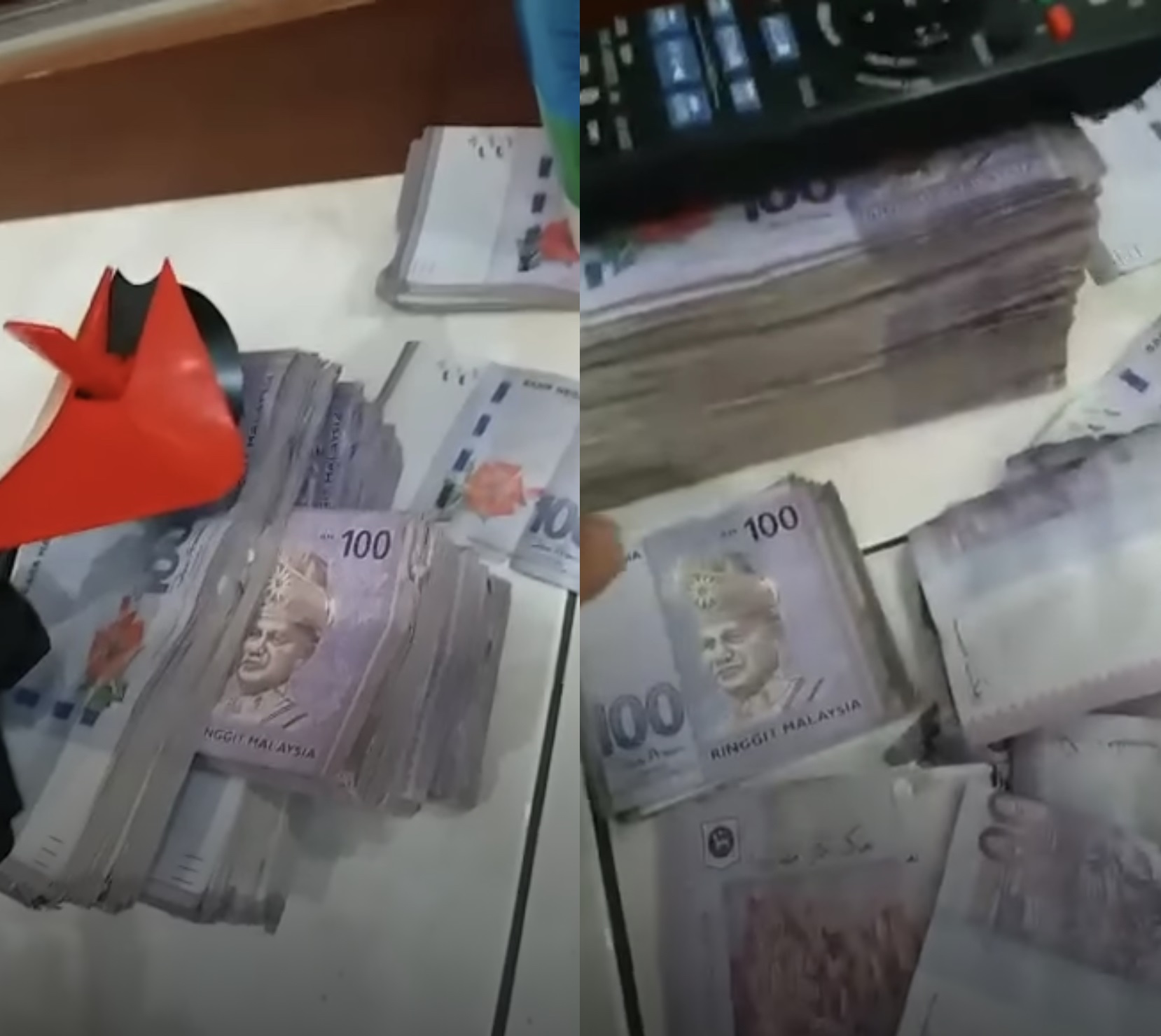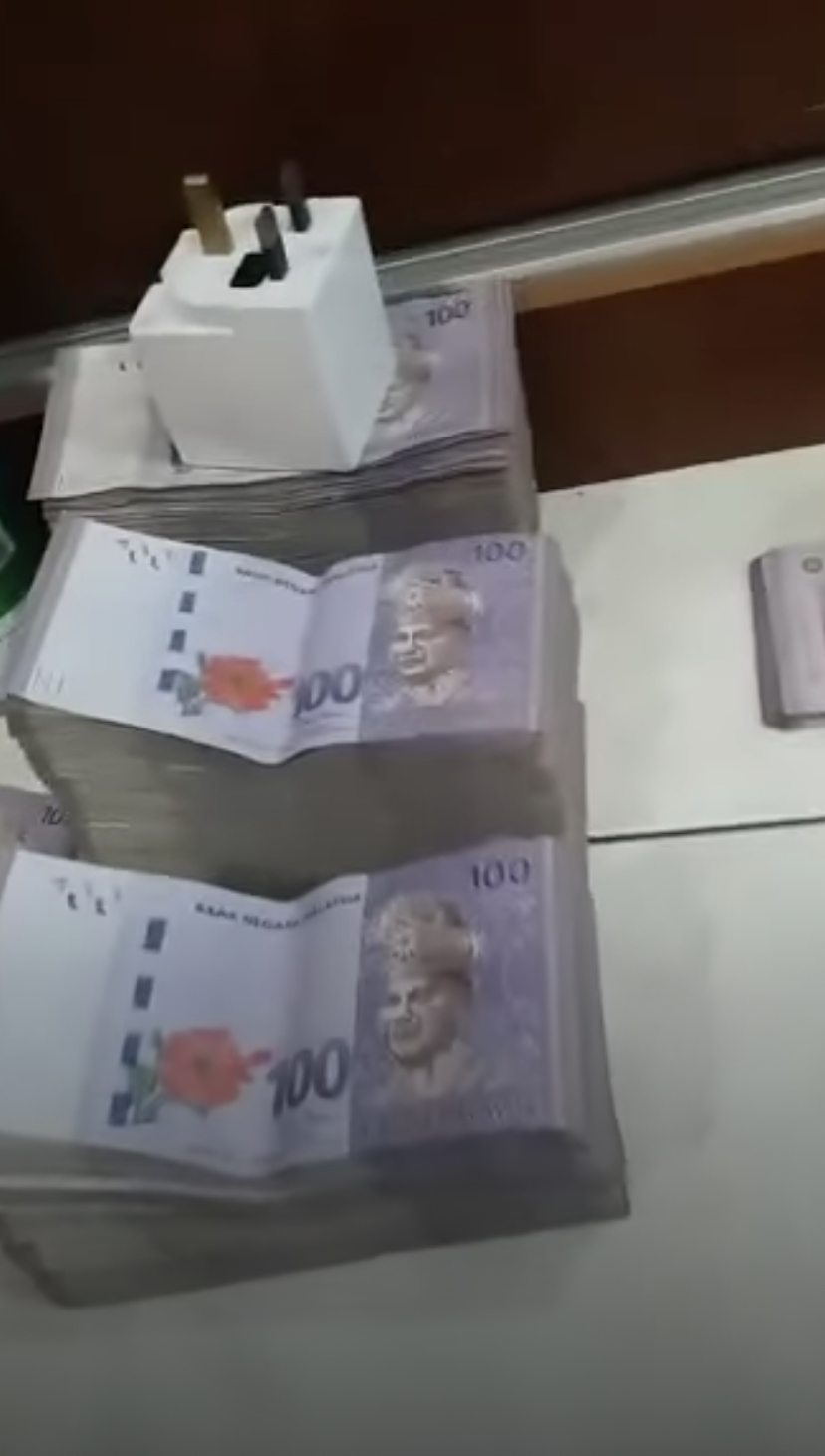 目测来算,绑成一叠中还分成了2小叠,1小叠应该有 RM15,000至 RM20,000,2小叠就是 RM30,000 至 RM40,000!视频里看到的至少有20叠,可想而知这里又是一笔庞大金额啊!