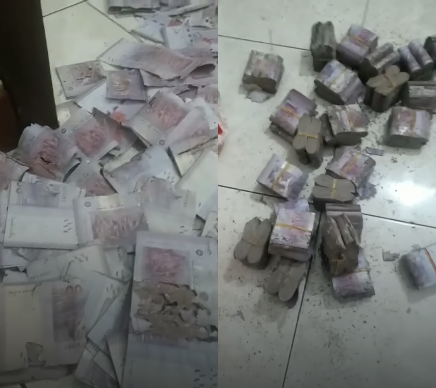 从视频中可以看到,堆积如山的 RM100 钞票摆满在屋内的地上,然而大多数都是已经被蛀坏的,有些甚至已经是面目全非!