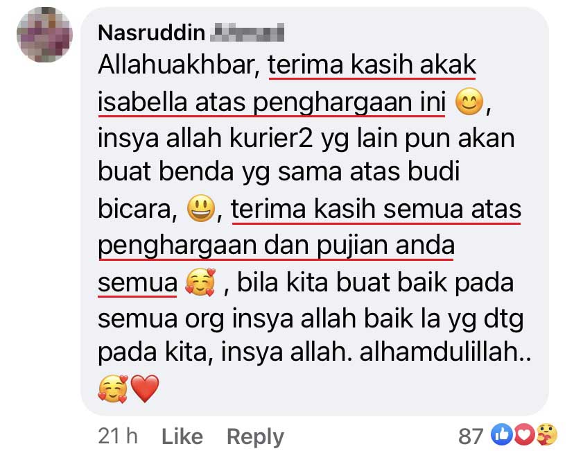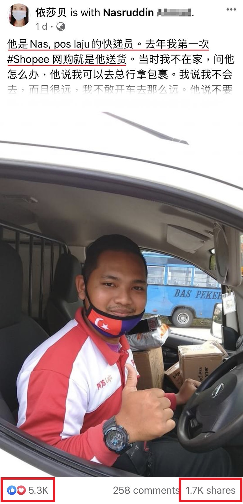 近日大马女网友依莎贝分享了一个正能量满满的真实故事,1年前她认识了一位很暖心的 Poslaju 快递员,该名快递员的敬业和服务精神让她十分感动和佩服,于是她决定通过面子书发文来表达对他的感谢和赞赏!该帖文在短短1天内,就已经多达6,000人点赞和近2,000次分享。