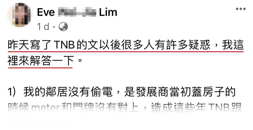 但我今天不是要说这个,我要说的是我为了家里的电费,跟 TNB 斗智斗勇好多年,甚至还激动到去节目留言跟前部长杨美盈要交代。