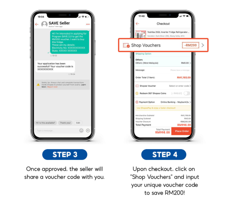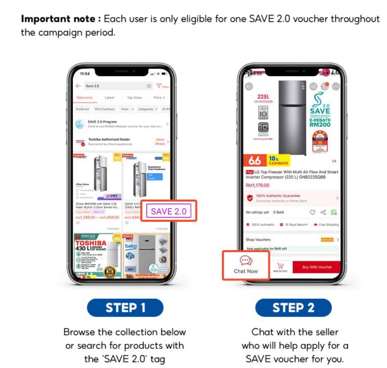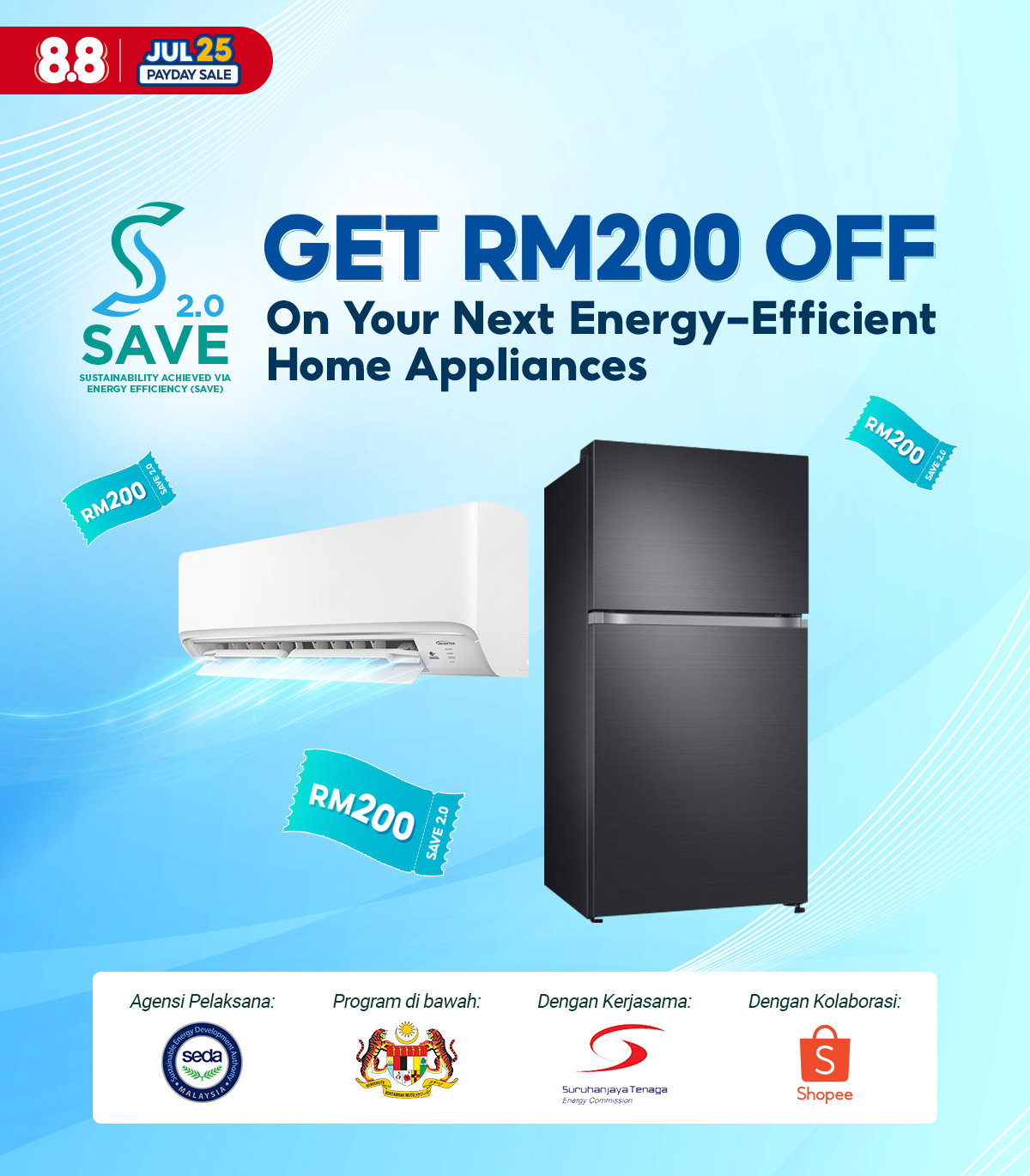 目的是为了提高民众对节能的意识,并且鼓励民众购买节能电器。成功申请该SAVE 2.0 计划的民众将可获得RM200 折扣券。但须通过Shopee 购买4或5颗星的节能冷气机或电冰箱。