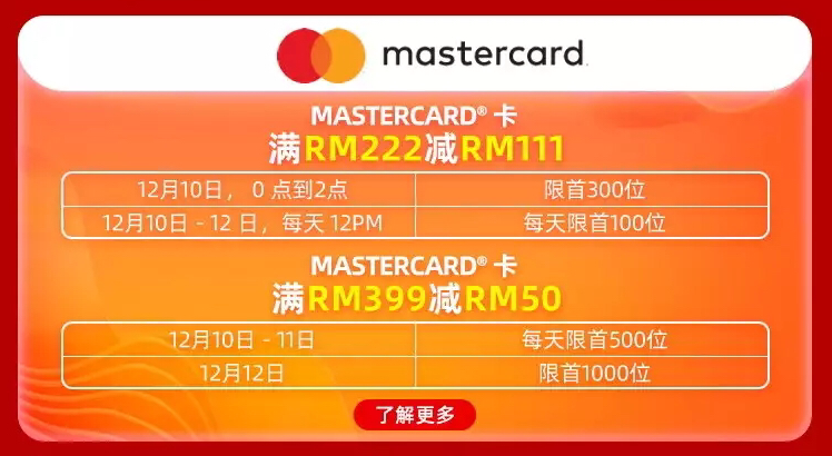 ▼限时限量刷Mastercard享RM222 减RM111的疯狂优惠: