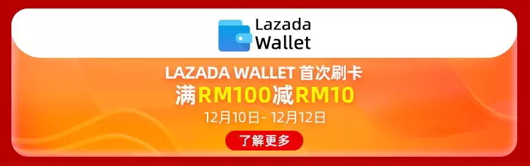 此外,这次双十二还有开通Lazada Wallet 的劲爆优惠!只要你是首次开通Lazada Wallet,淘宝就会送你首次刷卡满RM100 减RM10 作为开通礼!