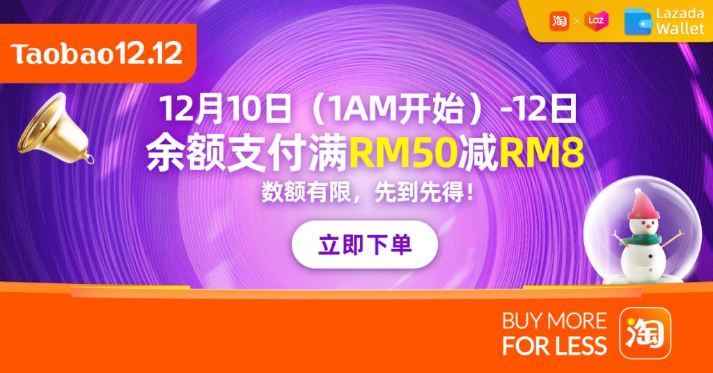 ▼淘宝一直呼吁大家开通Lazada Wallet 所以当然少不了余额支付优惠!12 月 10 日,1AM 开始大家就能享用余额满RM50 减RM8的优惠,不过数量有限,先到先得哦!