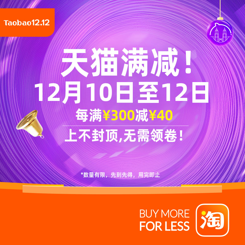 双十二作为年终大促,天猫自然也少不了“跨店满减”优惠!从12月10日起至12日,只要你购满¥300 就立减¥40!上不封顶而且还无需领卷!