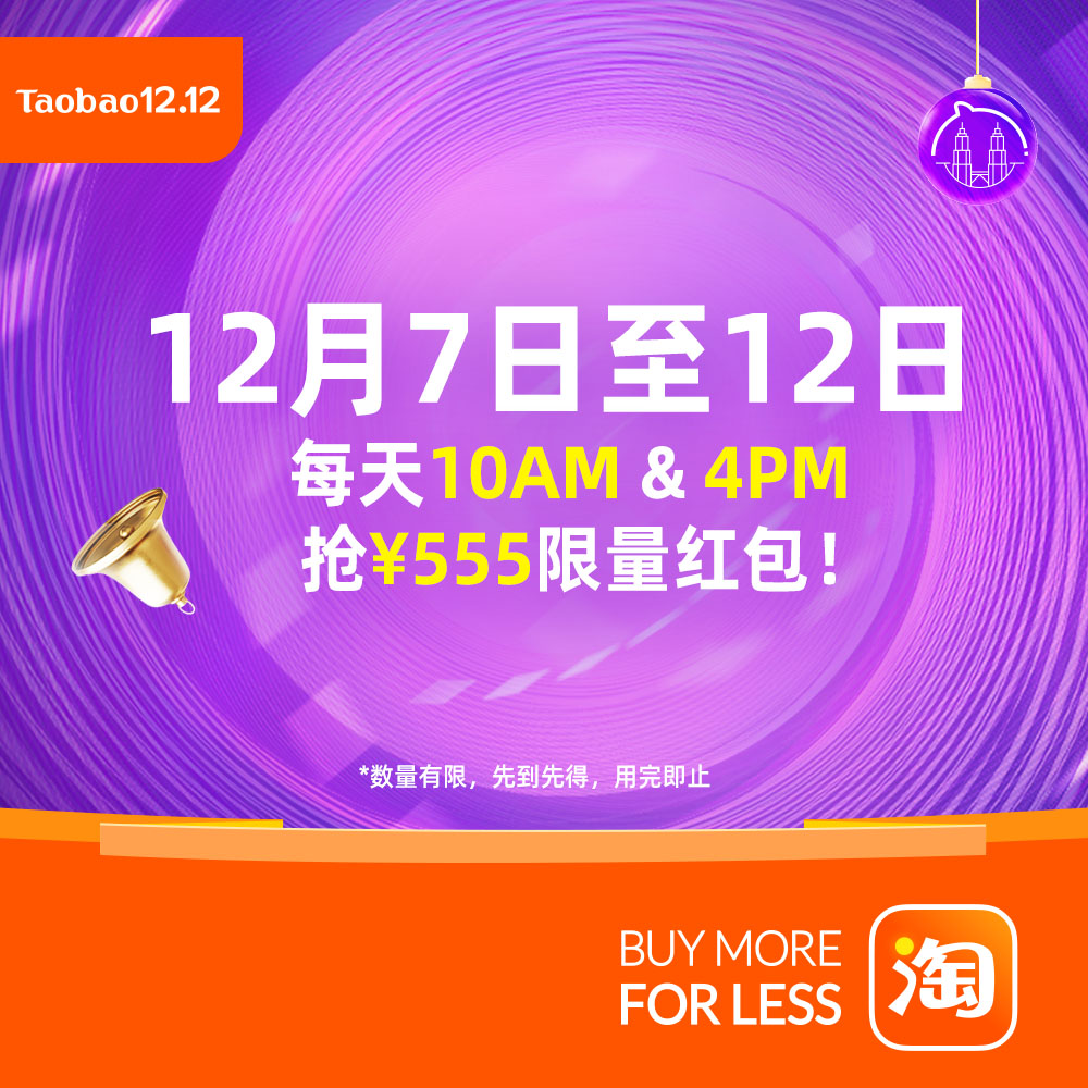 从12月7日起至12日,每天早上10点钟及下午4点钟,大家千万别忘了准时点进手淘APP 抢高达¥555的幸运大红包哦,只需购满¥1212 就能使用啦!