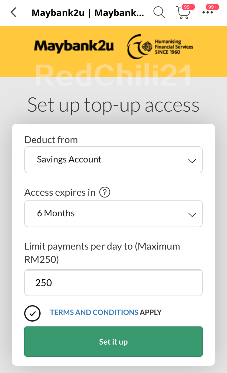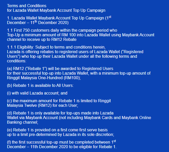 - 活动动期,每日首750位客户使用Maybank 帐户充值最少RM100 在Lazada Wallet ,可获得RM12 现金回扣