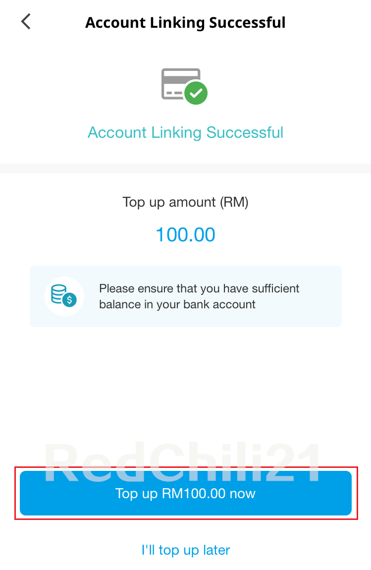▼ 步骤7:点击「Top Up RM100.00 Now」!