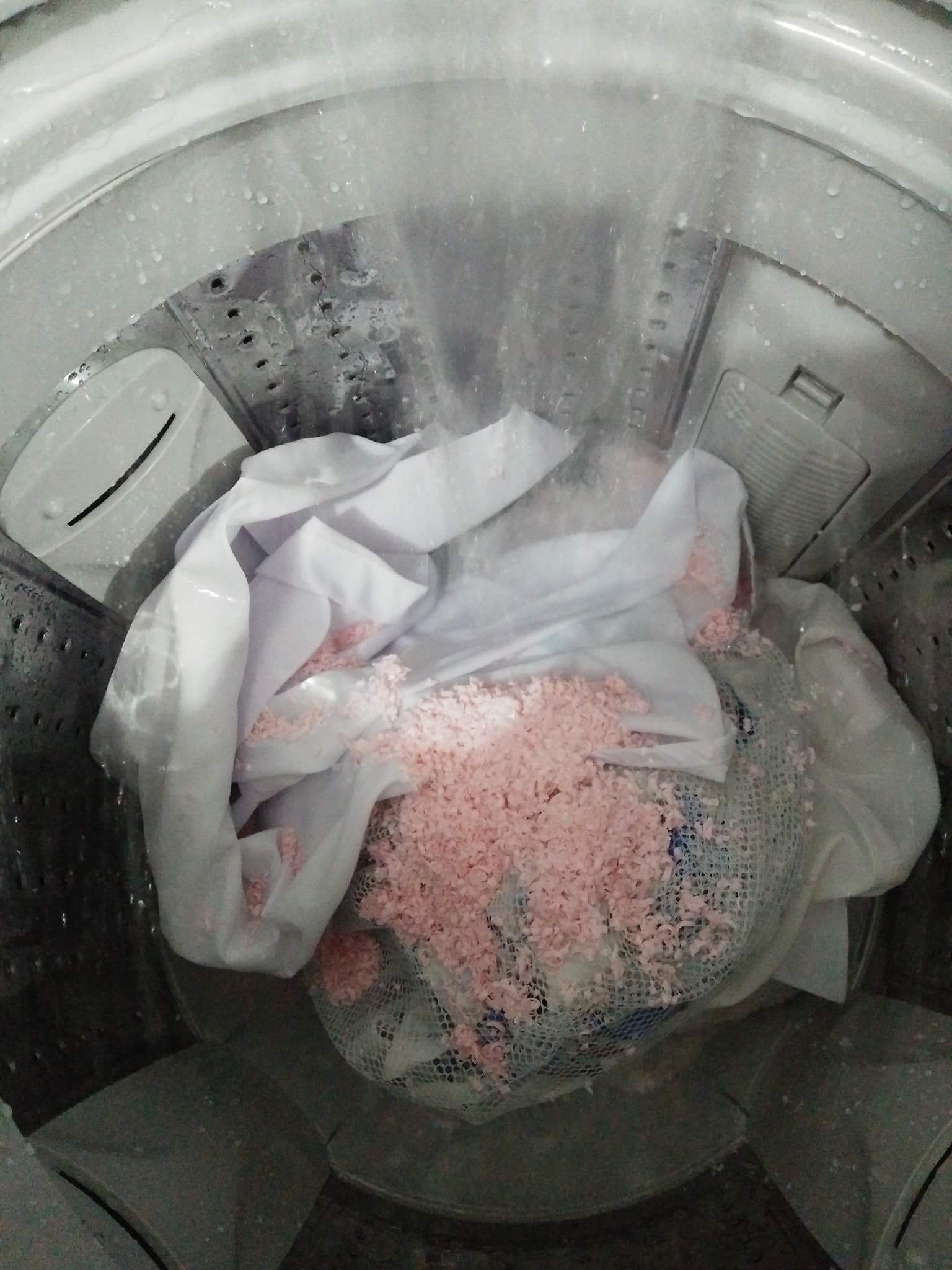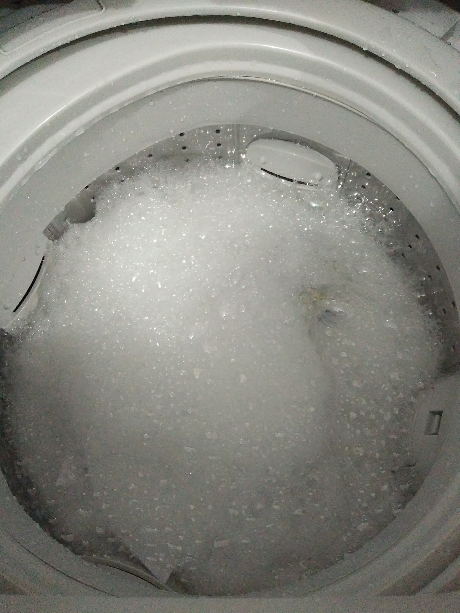 ▼ Step 3:隔天,将浸泡过的衣服放进洗衣机,加入肥皂和少许的洗衣粉/洗衣液并清洗。