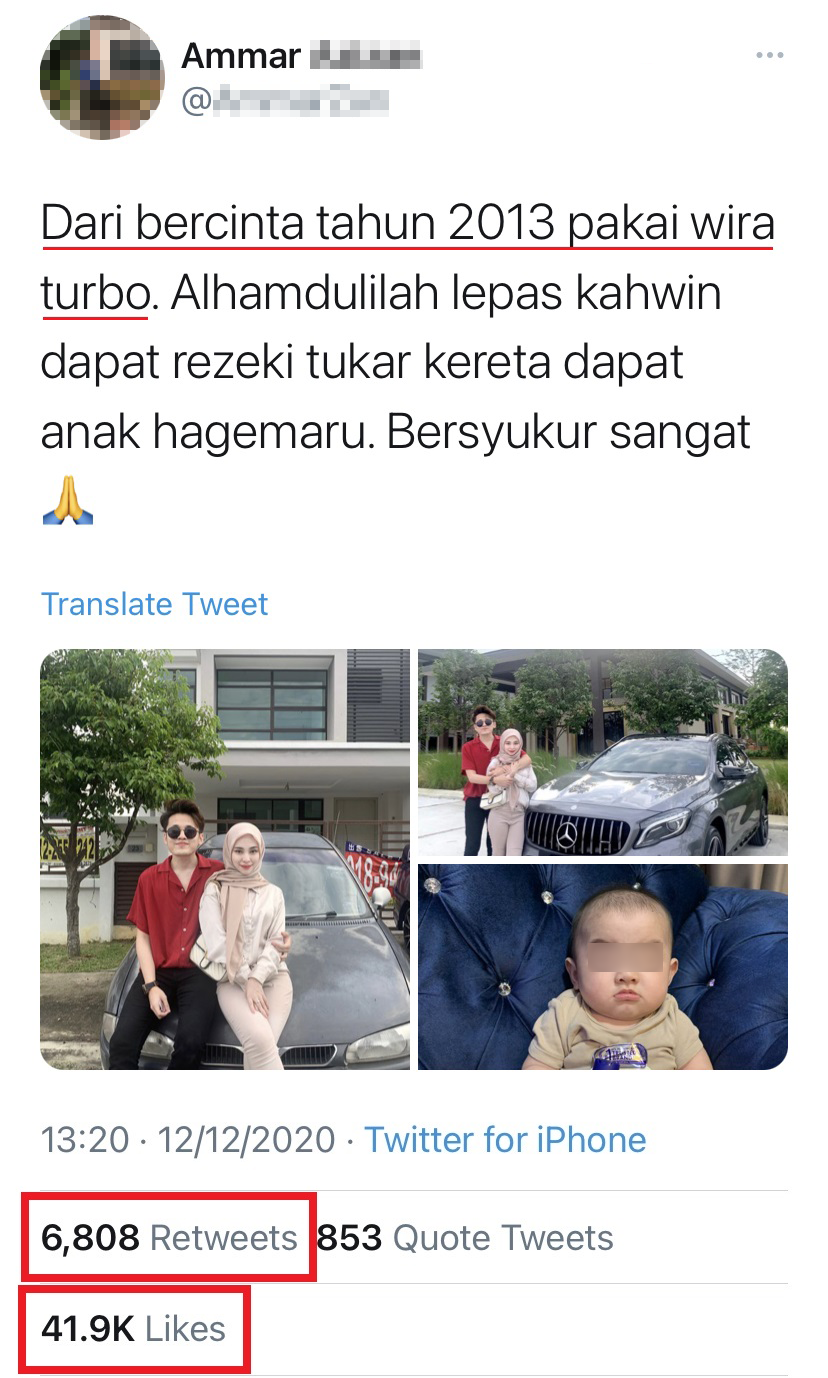 该推文写道:「从2013年交往的时候开的是 Proton Wira Turbo,结婚以后直到今天,已经拥有一辆 名贵的车,而且还有小孩!真的很感谢!」