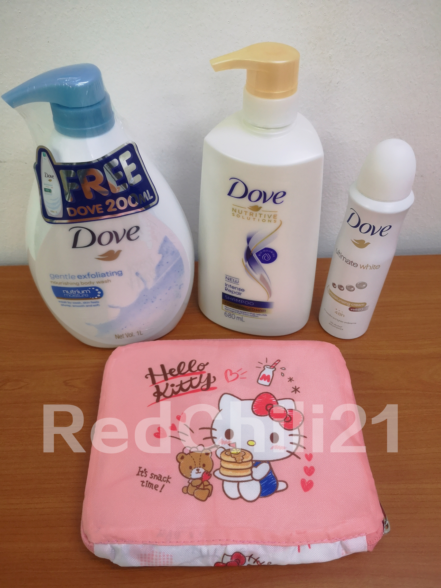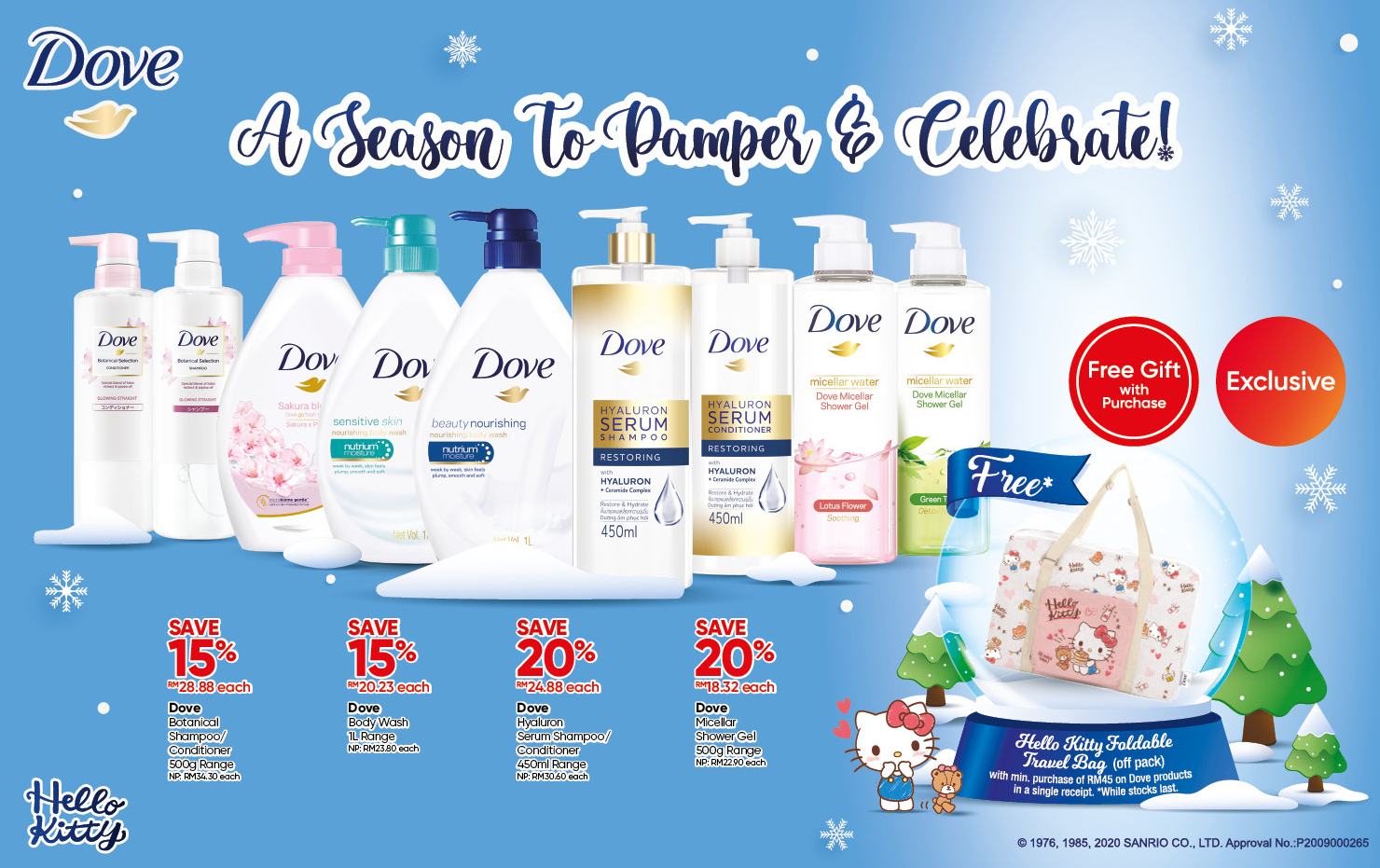 ▼ 只要你在Guardian 分店购买RM45 或以上的Dove 品牌的沐浴露、洗发液或护发素,就可免费获得Hello Kitty 旅行包啦!