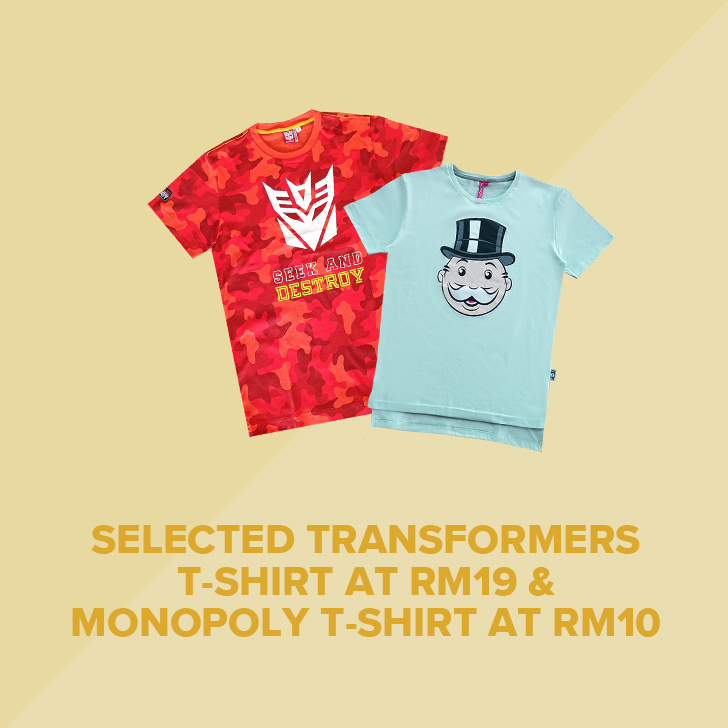 - 精选的变形金刚 (Transformers) T恤只需RM19 和地产大亨 (Monopoly) T恤只需RM10