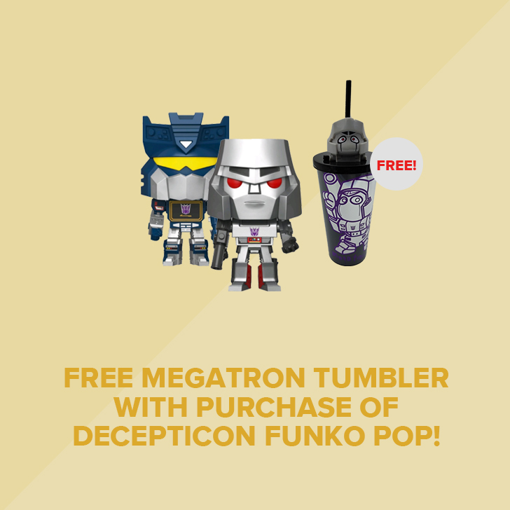 - 购买霸天虎搪胶玩偶(Decepticon Funko Pop)可获得免费的威震天(Megatron)水杯!
