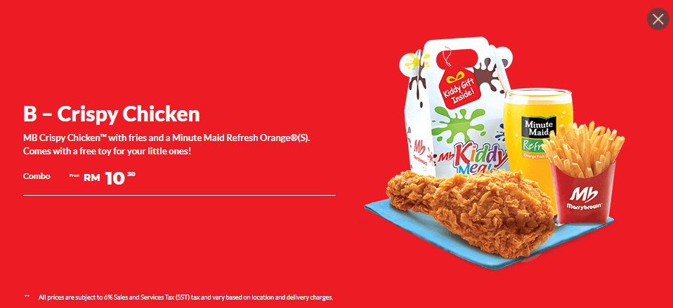 套餐包括:1支香脆炸鸡 + 1份薯条 + 1杯Minute Mate柳橙汁(S)+免费一个Kiddy Gift