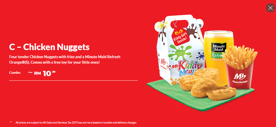 套餐包括:4片鸡肉块+ 1份薯条 + 1杯Minute Mate柳橙汁(S)+免费一个Kiddy Gift