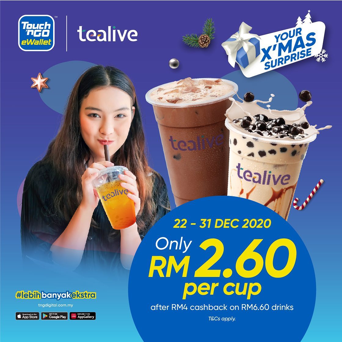 从即日起至12月31日,只要你通过Touch’N Go 电子钱包购买价值RM6.60 的Tealive 饮料就可享有RM4 现金回扣!也就说一杯饮料只需RM2.60!