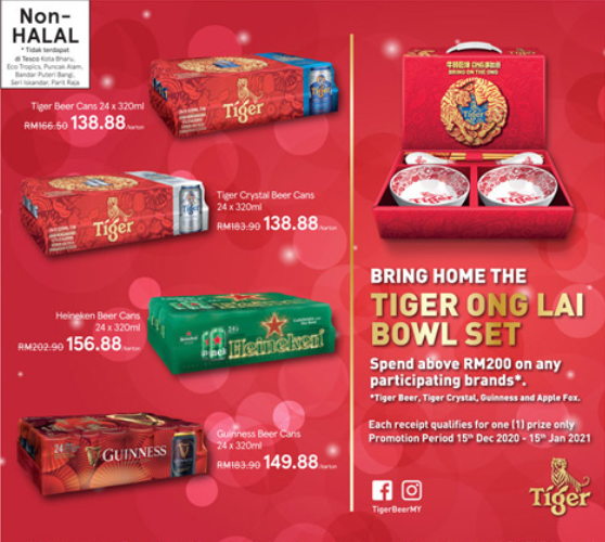 - 必须购买RM200 或以上指定品牌啤酒,就可免费获得Tiger Ong Lai 碗和餐具套组