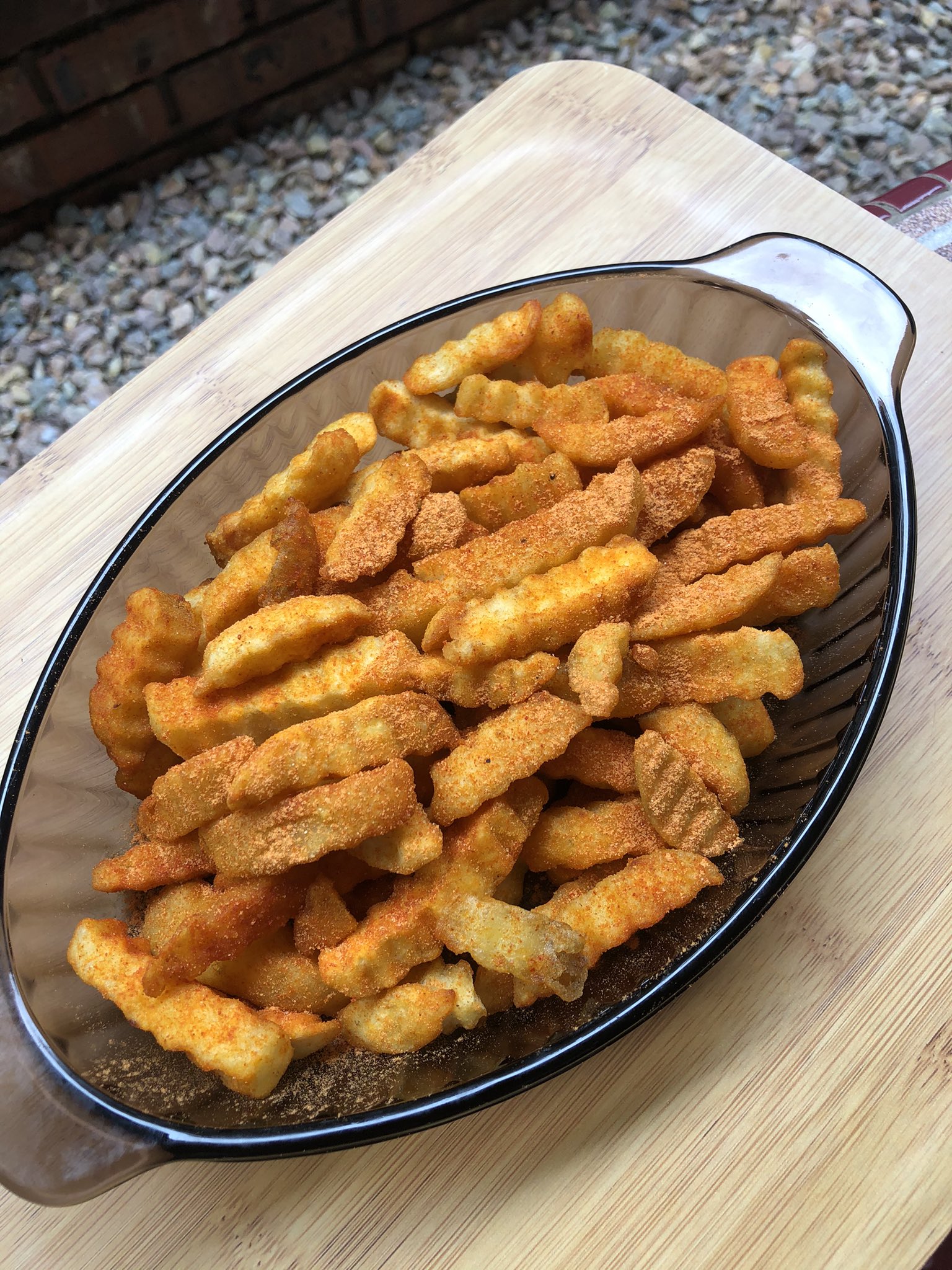 ▼ Step 2:将炸好的薯条倒在一个盘,加入峇峇辣椒粉和少许的调味料和糖。