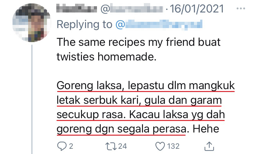 ▼ 还有网友分享炸laksa面条的食谱:「把laksa面条油炸一遍以后放在碗里,加入咖喱粉、糖和盐调味,搅拌均匀就可以吃了!」