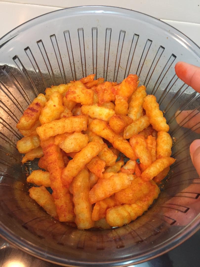 ▼ Step 1:将薯条放入锅里油炸至金黄色(炸的时间无需太久)。