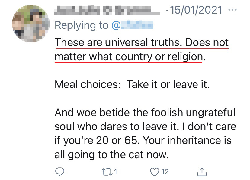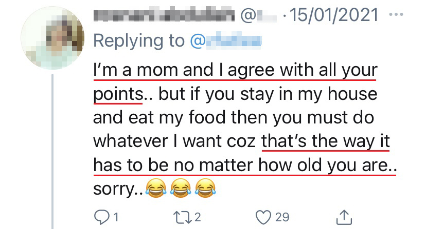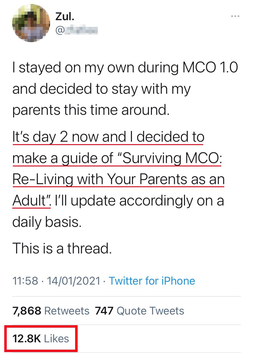 该推文写道:「之前MCO 1.0的时候我是一个人住,这次MCO 2.0我决定和父母一起住。今天是第二天了,我决定要写出一个指南有关于“如何在MCO期间如何生存”:以成人的身份和父母共存。」
