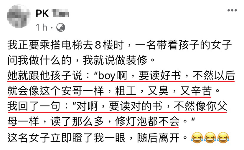 今天一则正能量的帖文在面子书迅速疯传,大马一名装修工人成功逆袭,用一句话怼回别人「看不起」的眼光,让网民看了都拍手叫好!