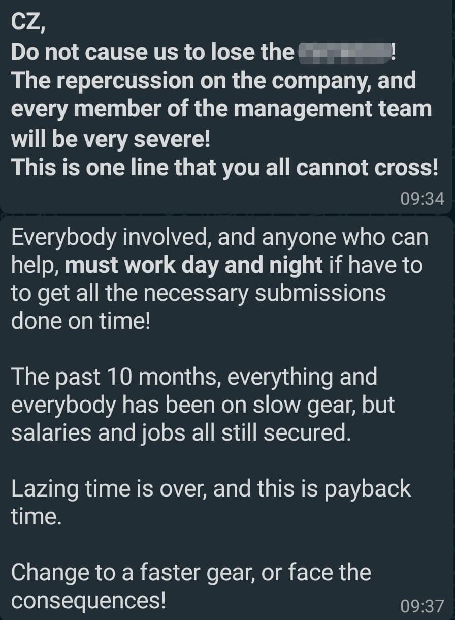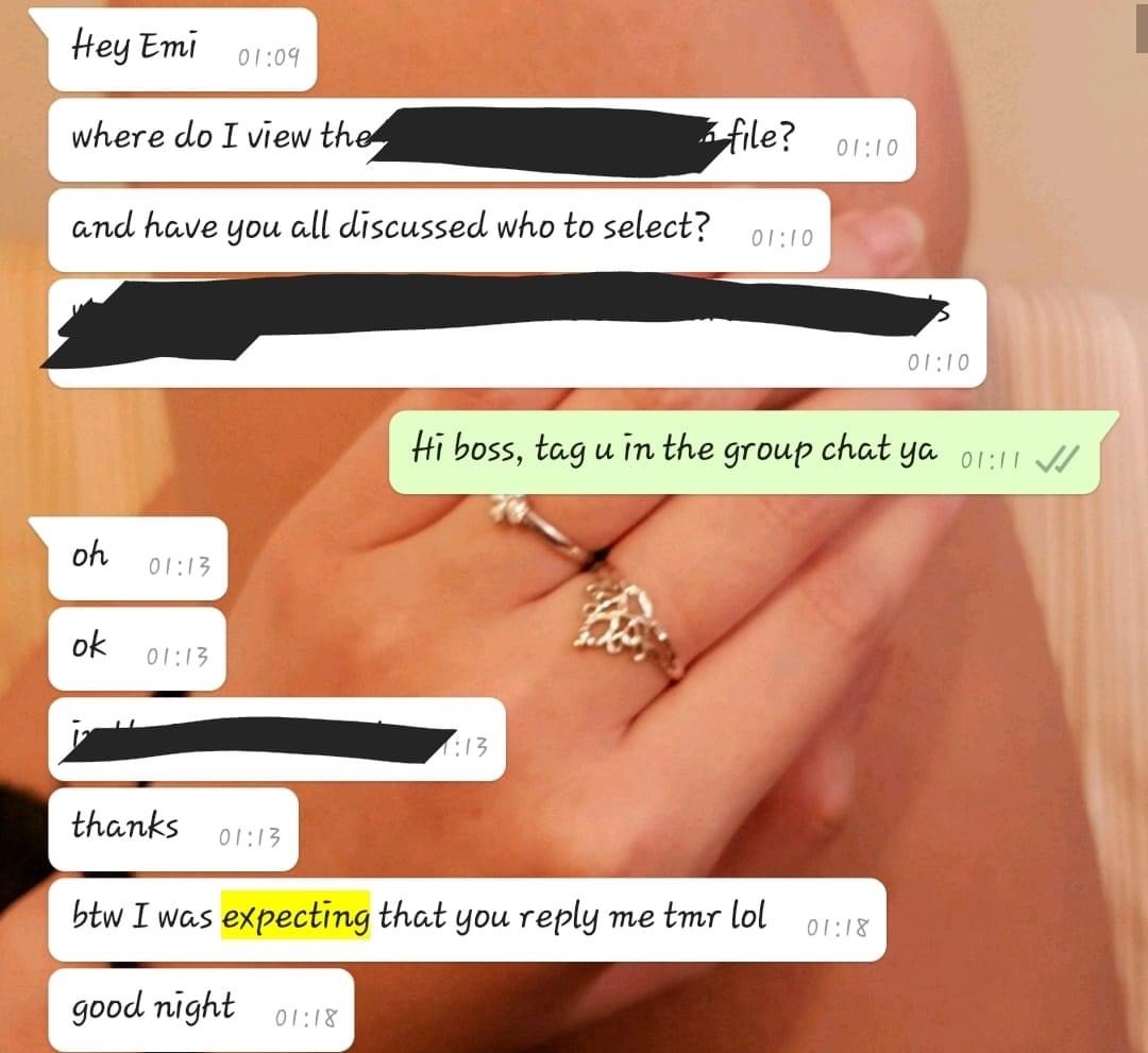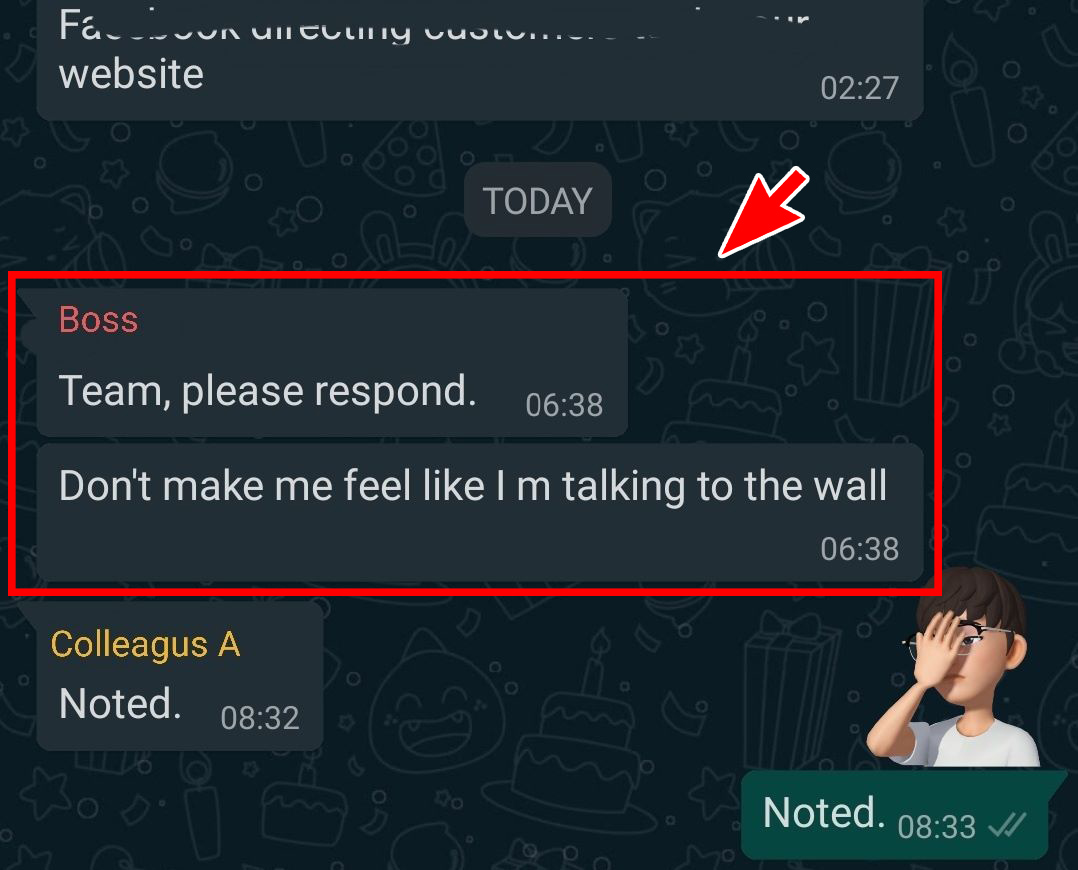 ▼ 凌晨2点27分,老板在 WhatsApp 群组发了一封有关工作的信息,结果迟迟等不到员工的任何回复。老板心里不是滋味,清晨6点38分时就再发了两封信息写道: